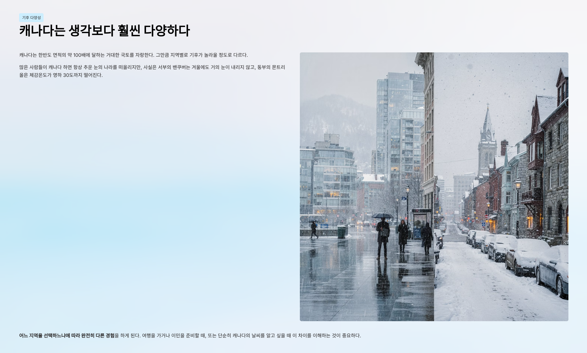 캐나다는 한반도 면적의 약 100배에 달하는 거대한 국토를 자랑한다. 그만큼 지역별로 기후가 놀라울 정도로 다르다. 많은 사람들이 캐나다 하면 항상 추운 눈의 나라를 떠올리지만, 사실은 서부의 밴쿠버는 겨울에도 거의 눈이 내리지 않고, 동부의 몬트리올은 체감온도가 영하 30도까지 떨어진다. 여행을 가거나 이민을 준비할 때, 또는 단순히 캐나다의 날씨를 알고 싶을 때, 어느 지역을 선택하느냐에 따라 완전히 다른 경험을 하게 된다.