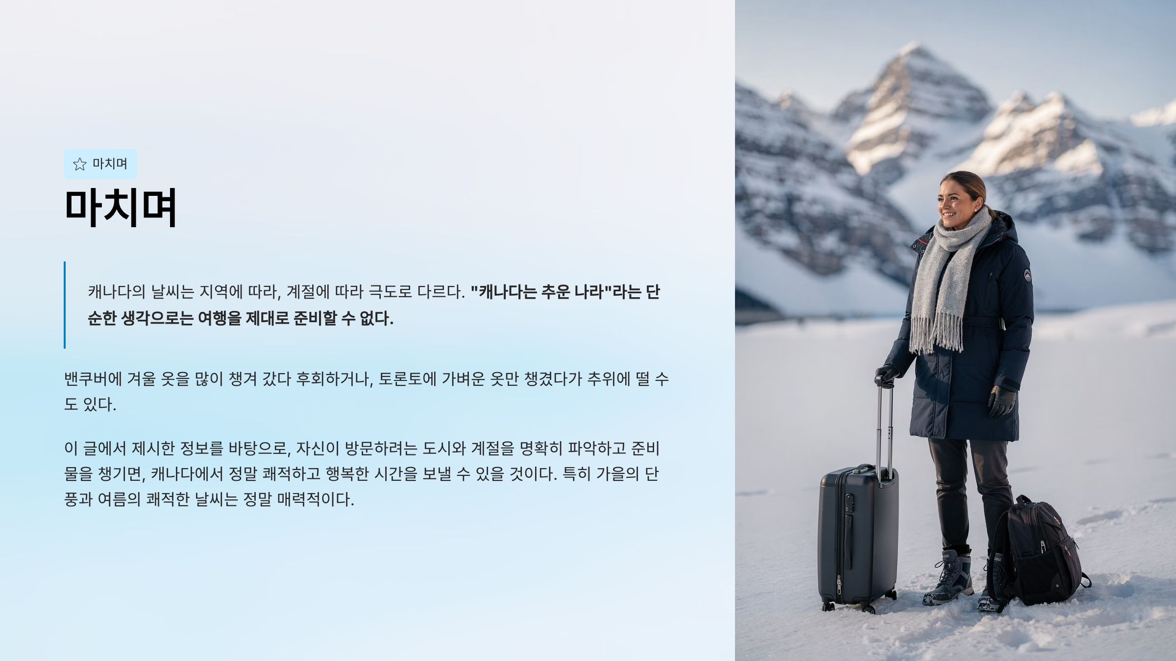 캐나다 여행을 계획 중이라면, 이제 날씨에 대한 불안감을 떨쳐버리고, 자신 있게 짐을 챙기고, 멋진 여행을 떠나보자!