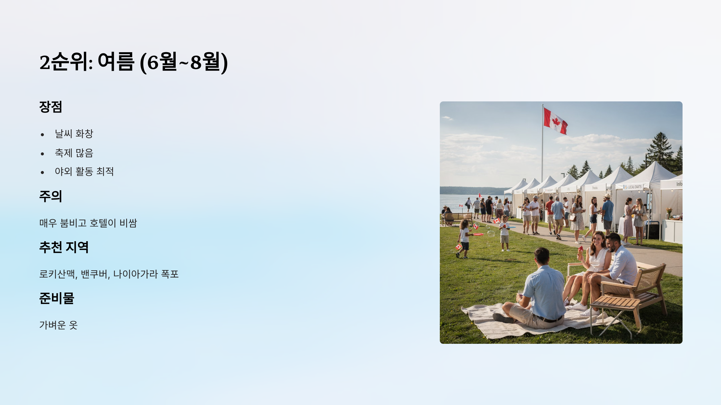 - 추천 지역: 로키산맥, 밴쿠버, 나이아가라 폭포