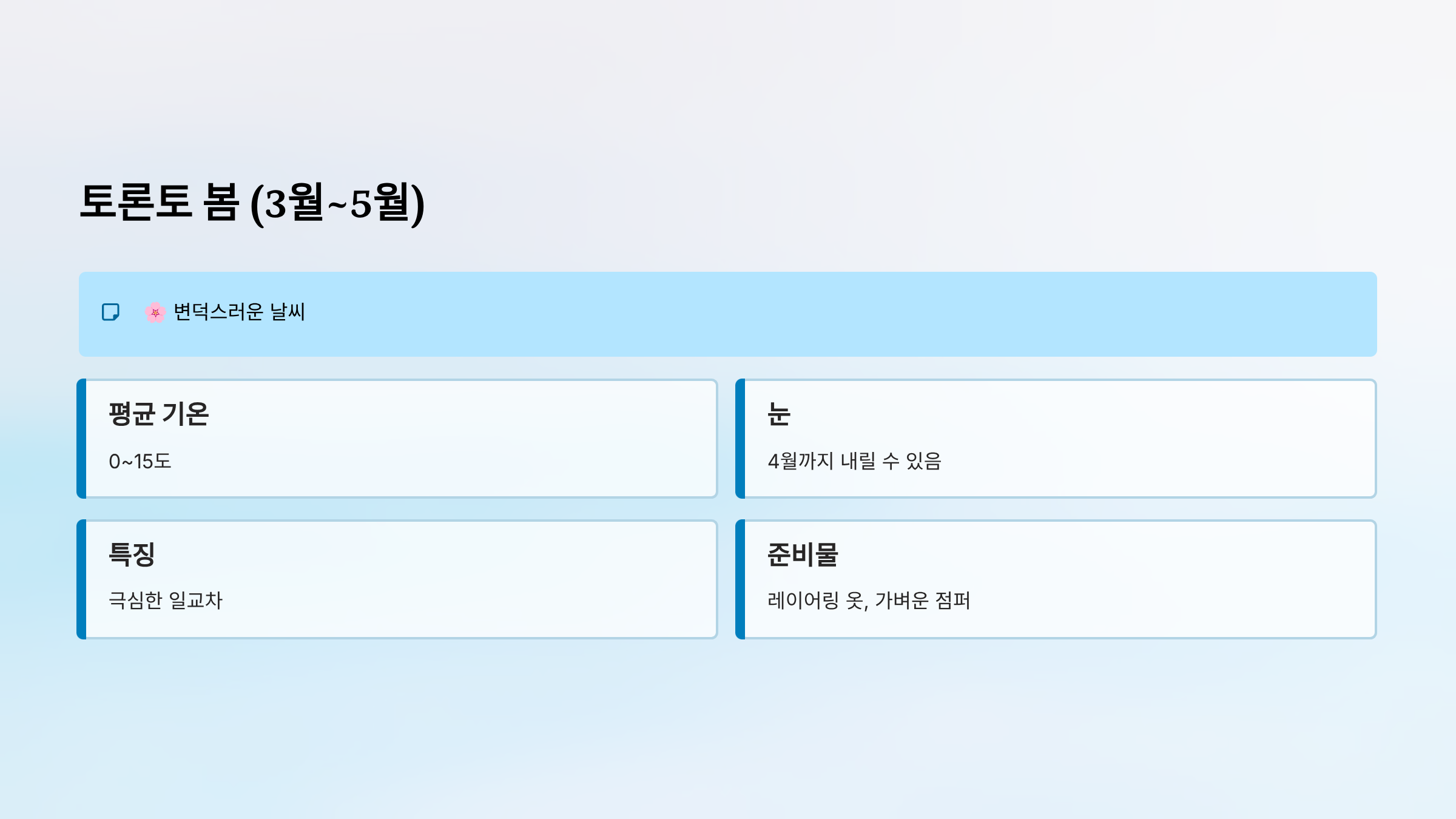 - 겨울: 토론토보다 체감온도 5~10도 더 낮음