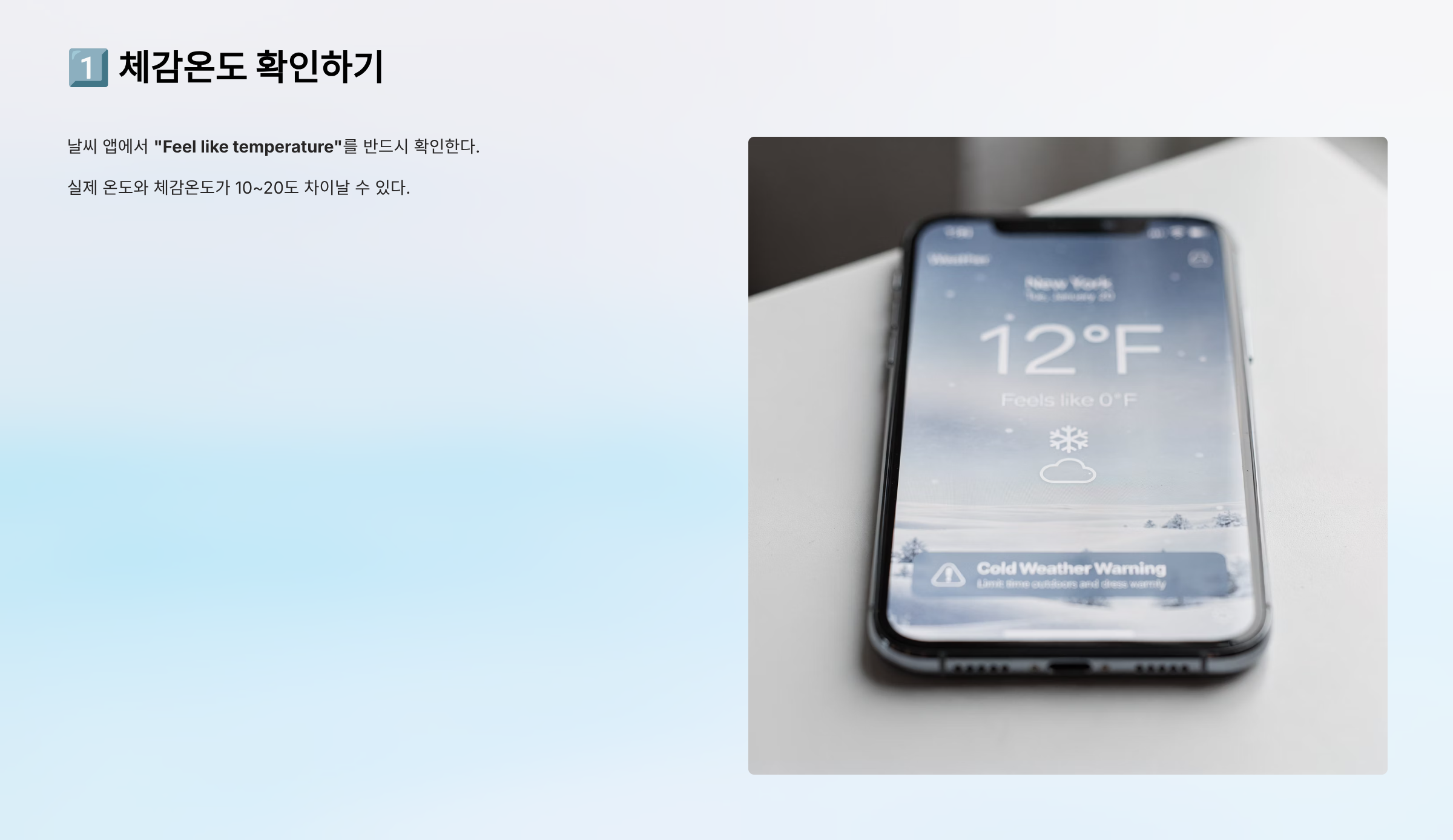 날씨 앱에서 "Feel like temperature"를 반드시 확인한다. 실제 온도와 체감온도가 10~20도 차이날 수 있다.