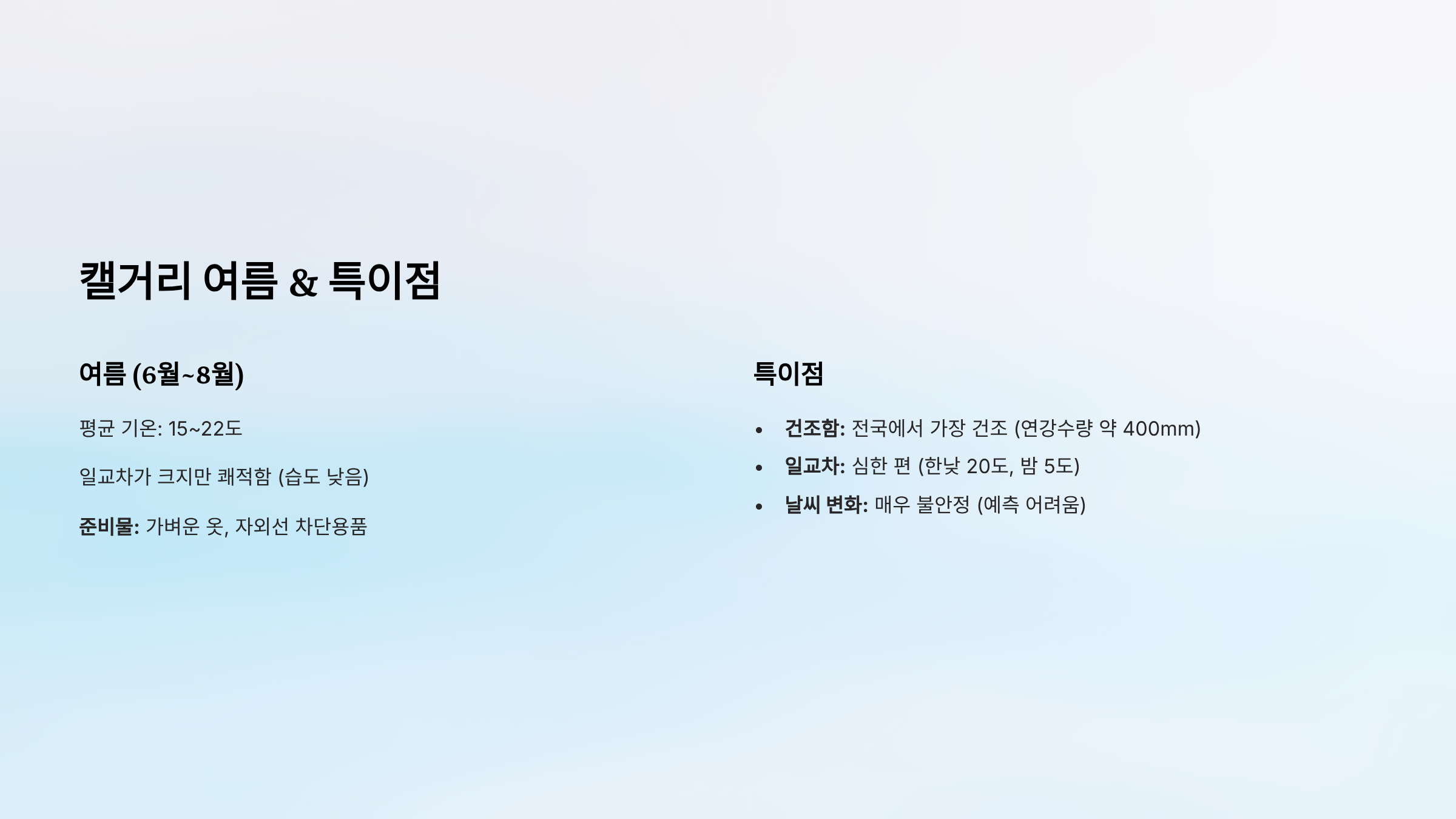 - 특징: 일교차가 크지만 쾌적함 (습도 낮음)