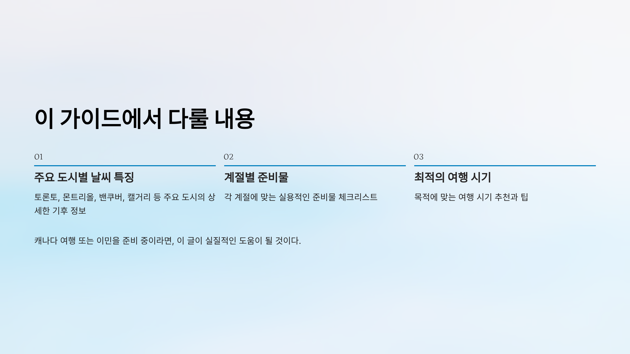 이 글에서는 캐나다의 주요 도시들의 날씨 특징, 계절별 준비물, 최적의 여행 시기를 완벽하게 정리했다. 캐나다 여행 또는 이민을 준비 중이라면, 이 글이 실질적인 도움이 될 것이다.