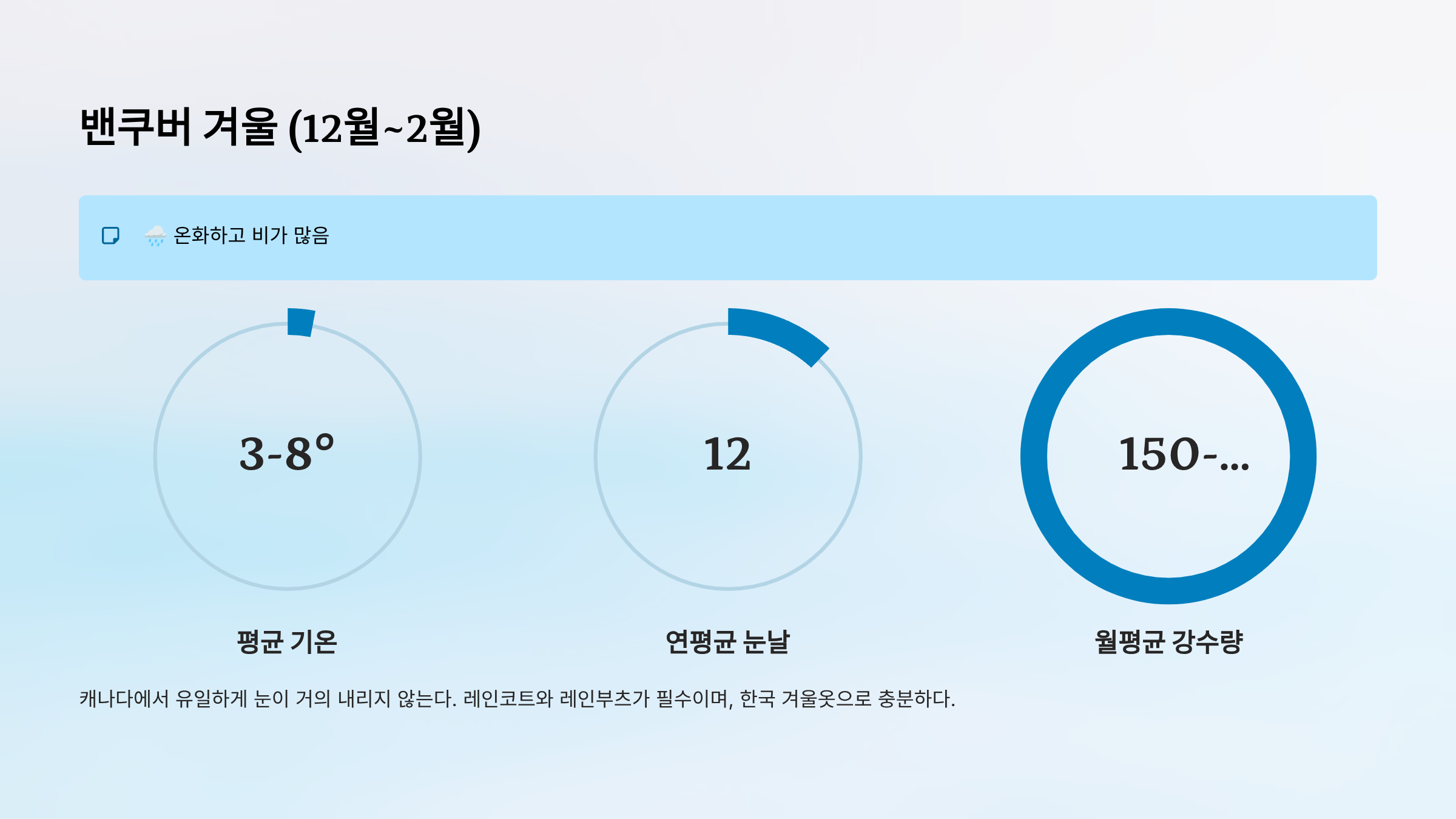 - 특징: 캐나다에서 유일하게 눈이 거의 내리지 않음 (연평균 눈날 12일)