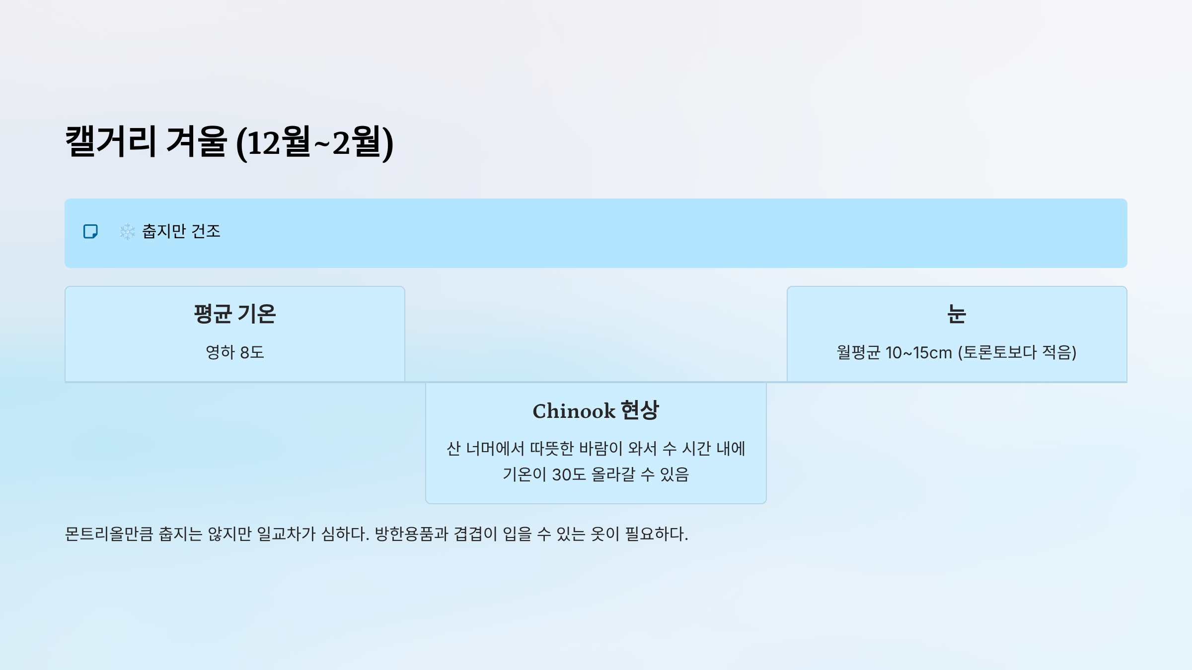 - 특징: 몬트리올만큼 춥지는 않지만 일교차가 심함