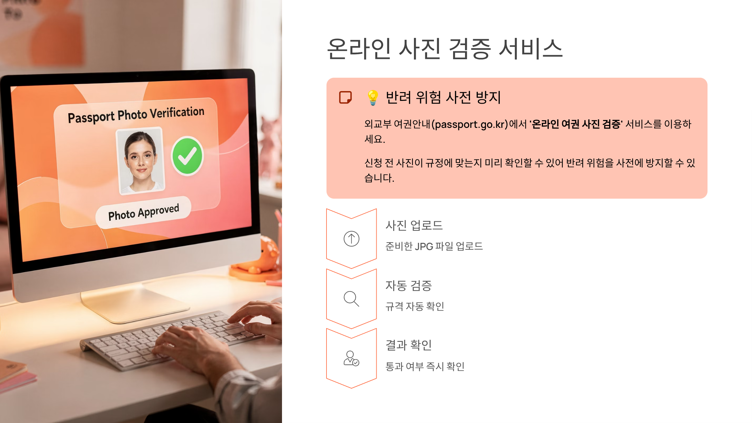 - 외교부 여권안내(passport.go.kr)에서 '온라인 여권 사진 검증' 서비스 이용