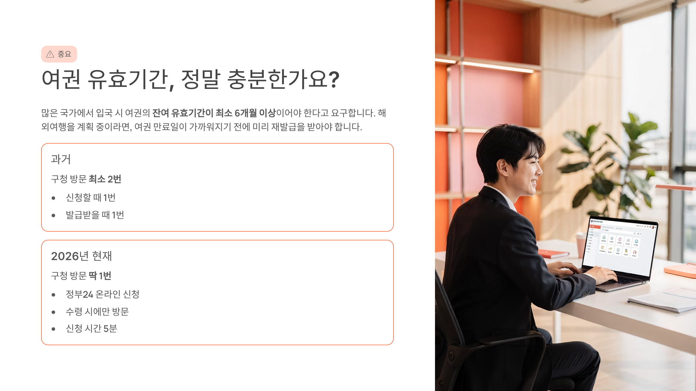 여권 유효기간이 남았는데 충분한가? 많은 국가에서 입국 시 여권의 잔여 유효기간이 최소 6개월 이상이어야 한다고 요구한다. 따라서 해외여행을 계획 중이라면, 여권 만료일이 가까워지기 전에 미리 재발급을 받아야 한다. 과거에는 여권 재발급을 받으려면 구청을 최소 2번 방문해야 했다. 신청할 때 한 번, 발급받을 때 한 번. 하지만 이제는 다르다. 2026년 현재, 정부24에서 온라인으로 신청하면 구청을 딱 한 번만 방문하면 된다. 더욱이 신청 과정은 5분이면 충분하다. 이 글에서는 여권 재발급 온라인 신청의 단계별 절차, 필수 준비물, 사진 규격, 수수료, 소요 기간, 그리고 반려를 피하는 방법까지 완벽하게 정리했다. 온라인 신청으로 시간을 절약하고, 해외여행 준비에 더 집중해보자.