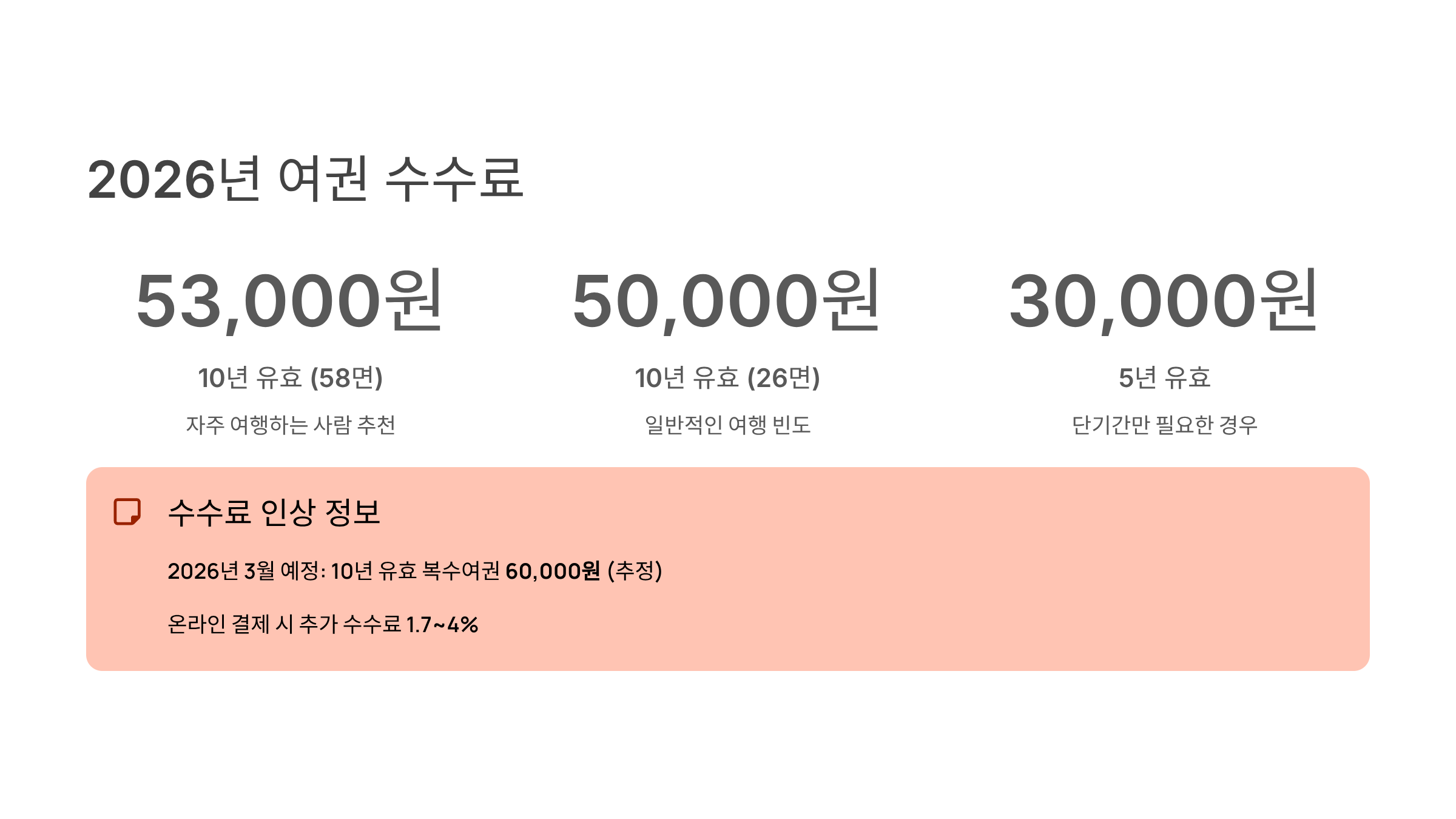 - 2026년 3월 예정: 10년 유효 복수여권 60,000원 (추정)