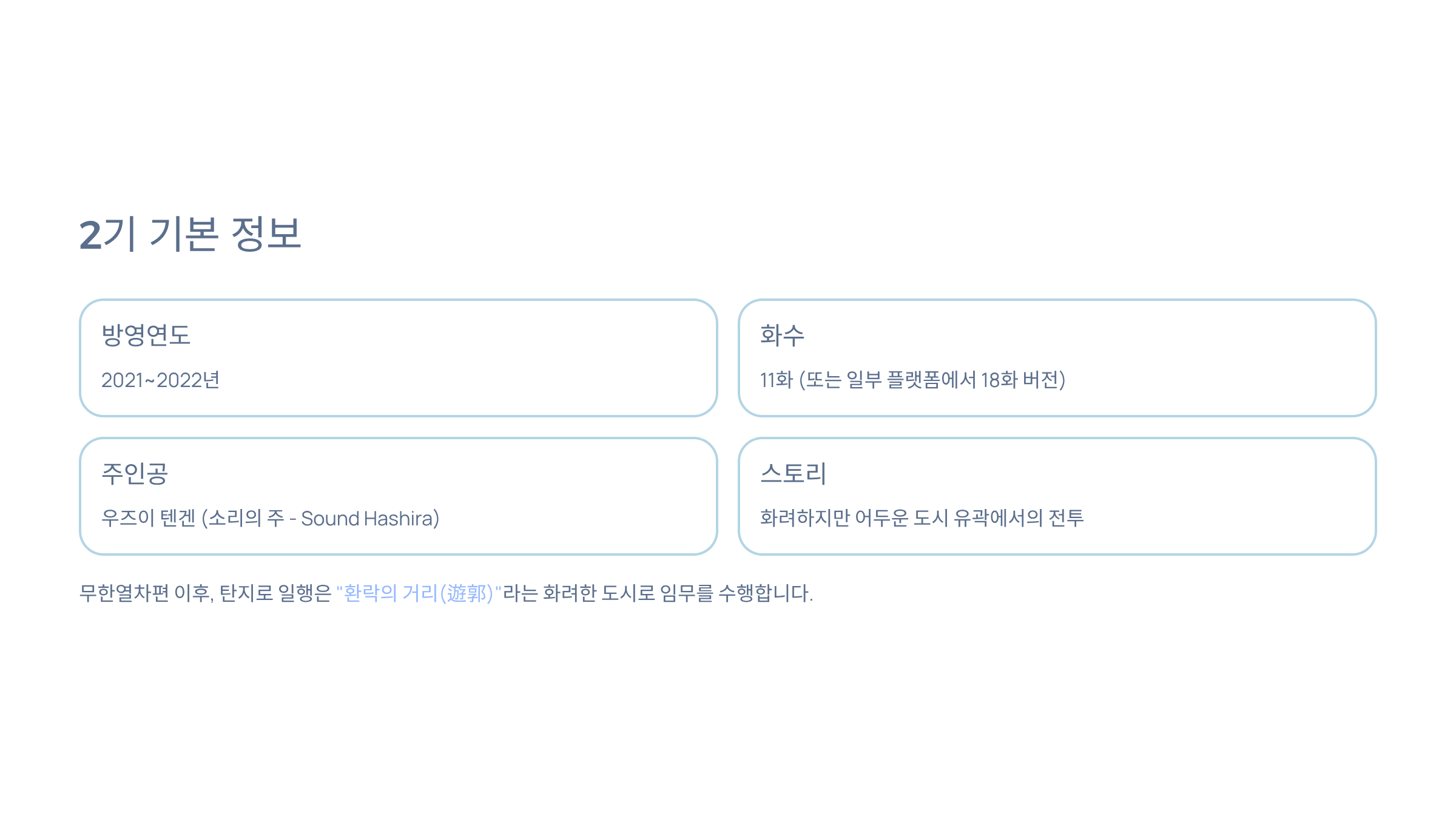 | 3️⃣ | 귀멸의 칼날 2기 (환락의 거리편) | TV 애니 | 11화 | 2021~22년 |