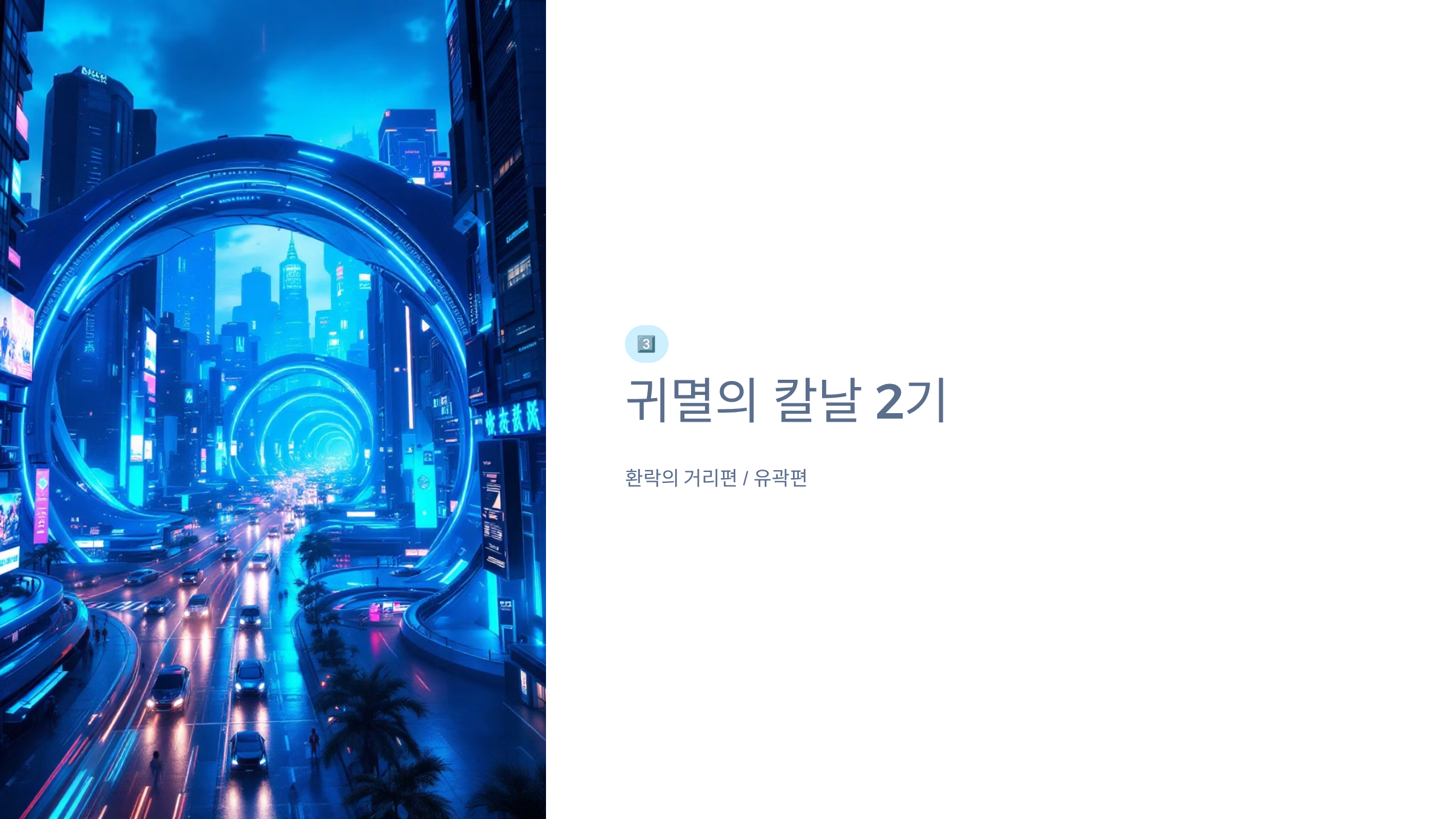 무한열차편 이후, 탄지로 일행은 **"환락의 거리(遊郭)"**라는 화려한 도시로 임무를 수행합니다.