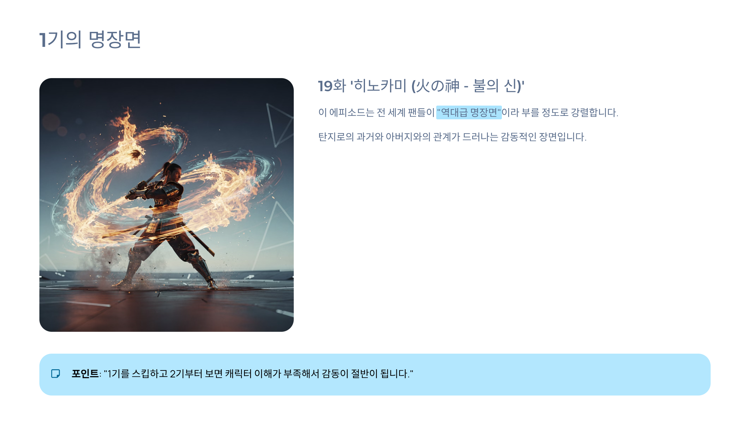 이 에피소드는 전 세계 팬들이 **"역대급 명장면"**이라 부를 정도로 강렬합니다. 탄지로의 과거와 아버지와의 관계가 드러나는 감동적인 장면입니다.
