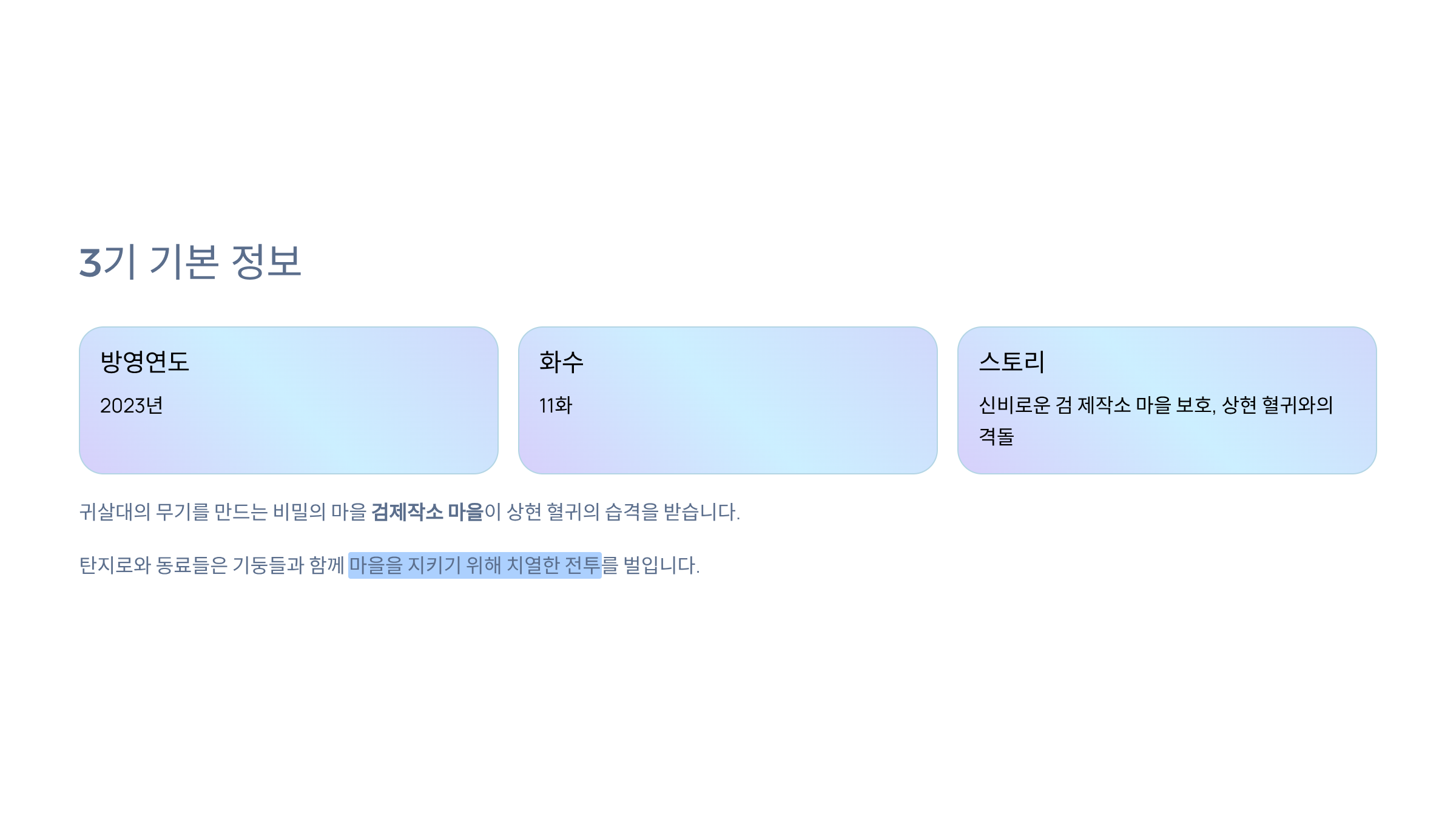 | 4️⃣ | 귀멸의 칼날 3기 (도공마을편) | TV 애니 | 11화 | 2023년 |