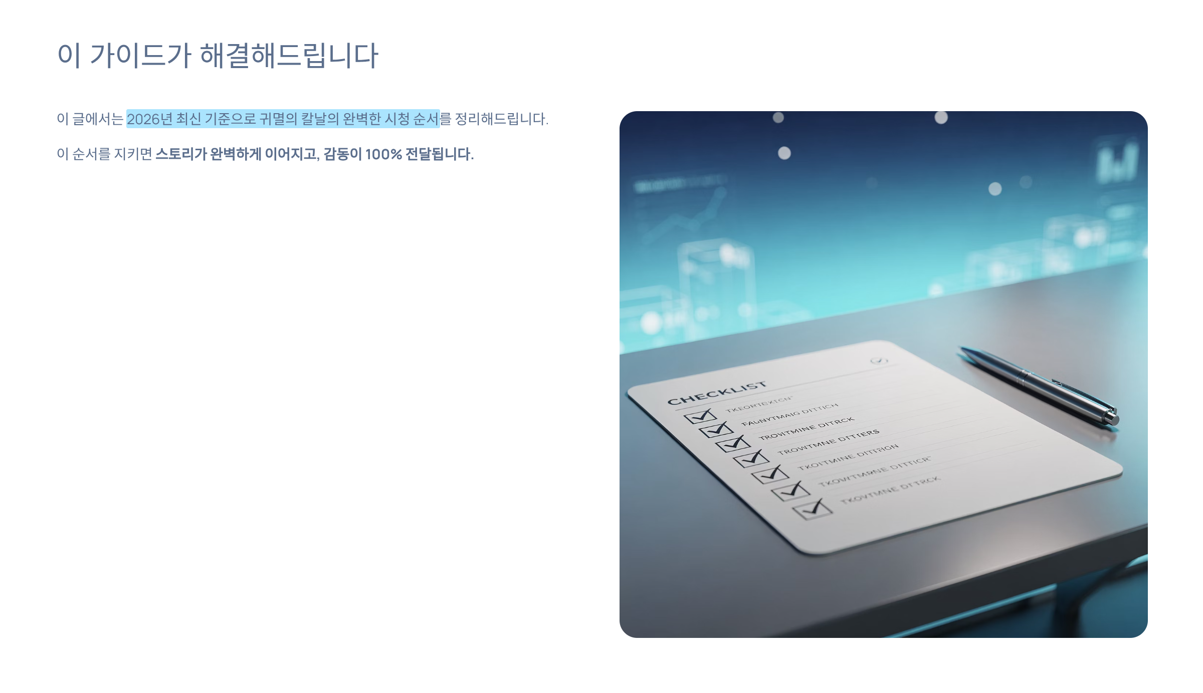 "이 순서로 보면 스토리가 완벽하게 이어지고, 감동이 100% 전달됩니다!"