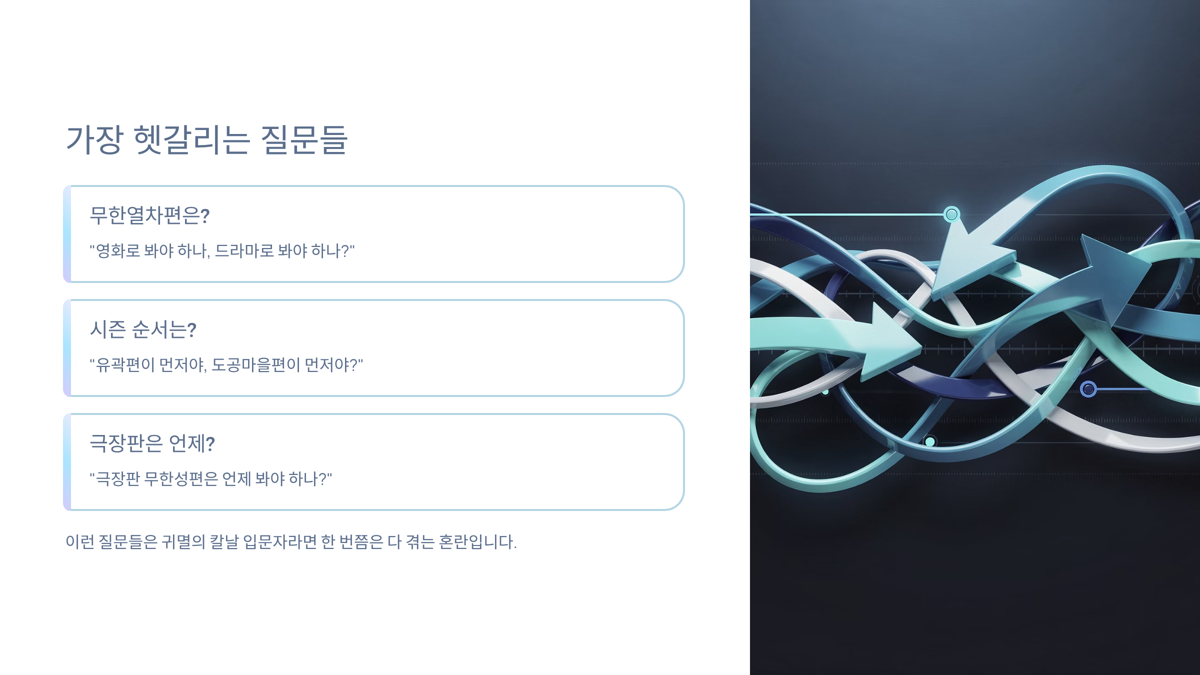 "1기가 있고, 2기도 있고, 극장판도 있고, 무한열차편도 있고... 어느 걸 먼저 봐야 합니까?"