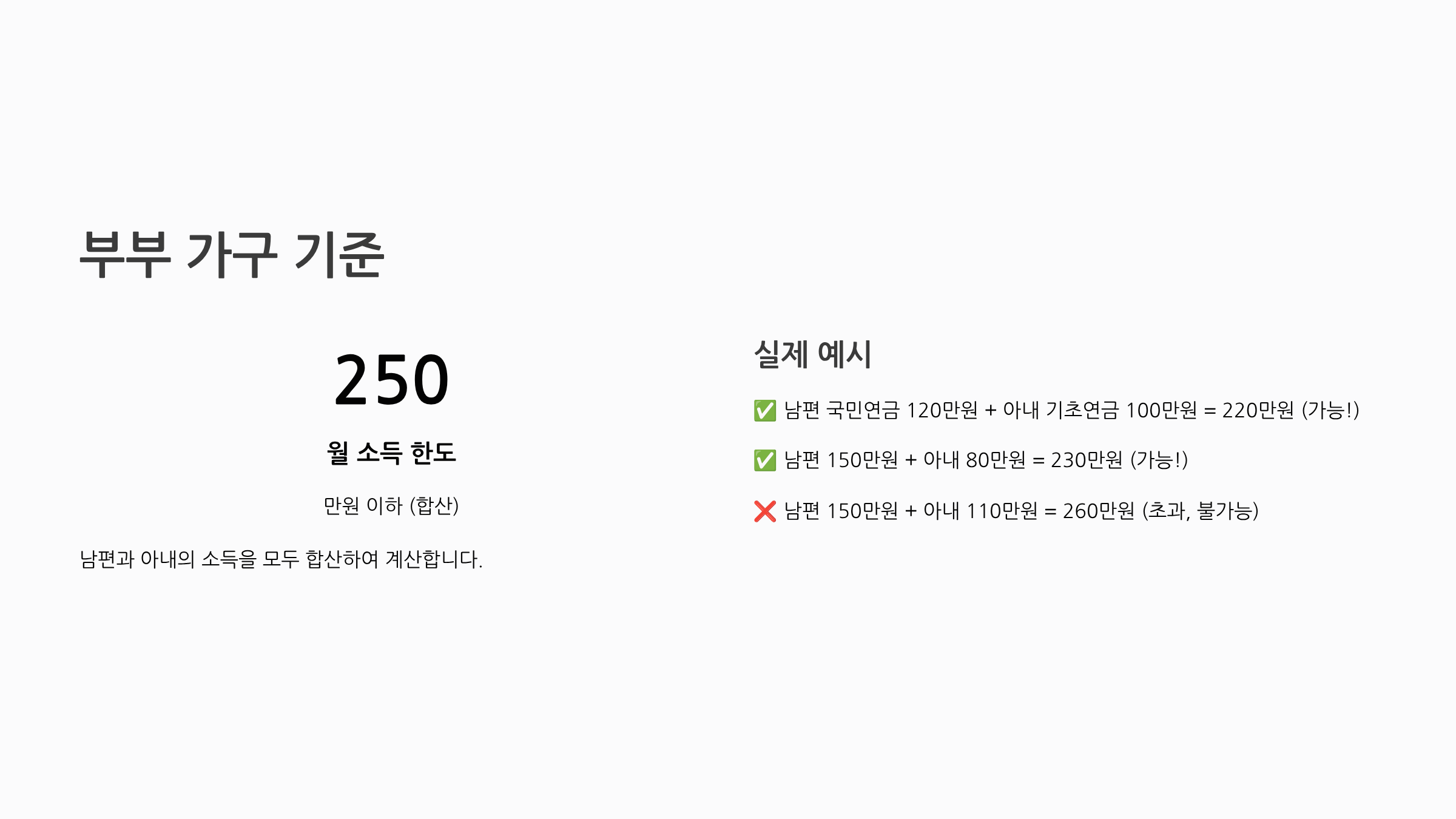 - ✅ 남편 국민연금 120만원 + 아내 기초연금 100만원 = 220만원 (가능!)