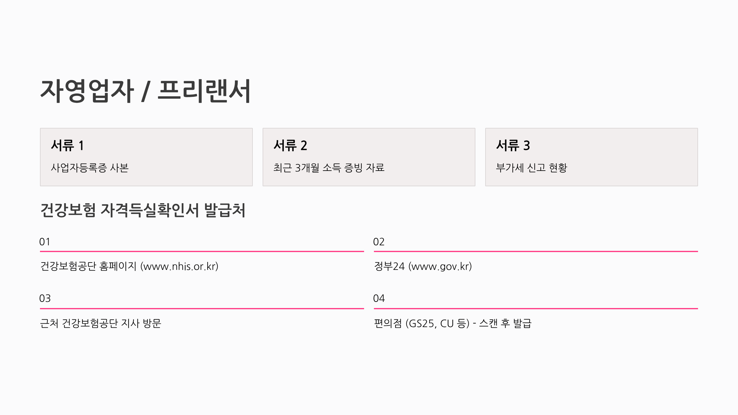 | 4. 건강보험 자격득실확인서 | 최근 1년치 | 건강보험공단 |