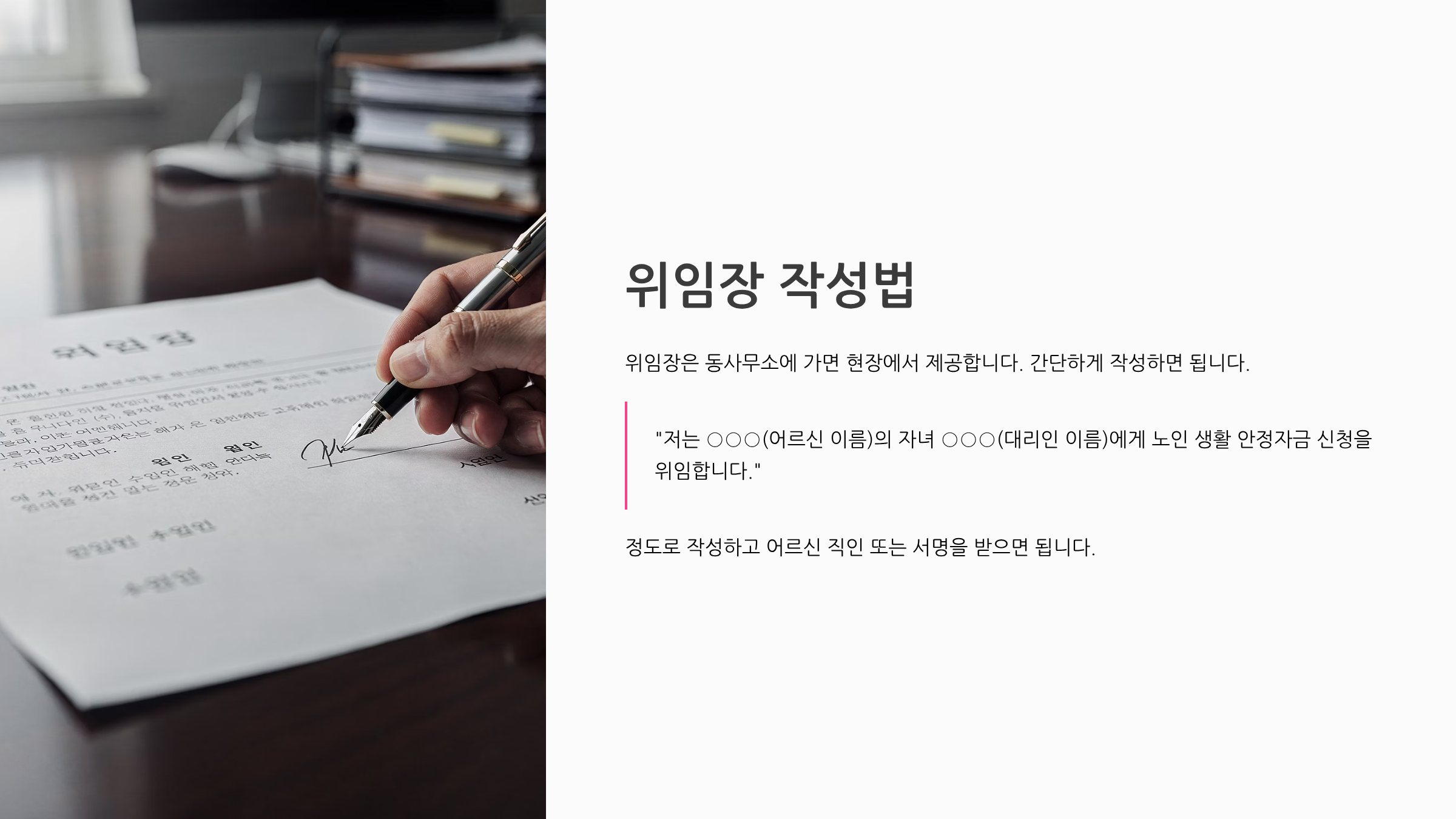 "저는 ○○○(어르신 이름)의 자녀 ○○○(대리인 이름)에게 노인 생활 안정자금 신청을 위임합니다."