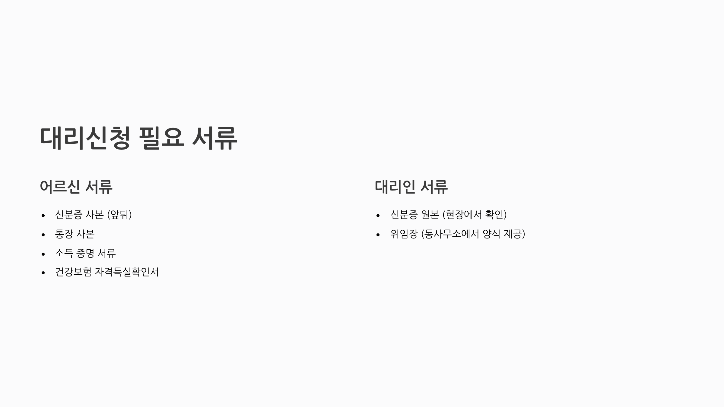 거동이 불편하거나 여러 사정으로 직접 방문할 수 없다면 자녀나 가족이 대신 신청할 수 있습니다.
