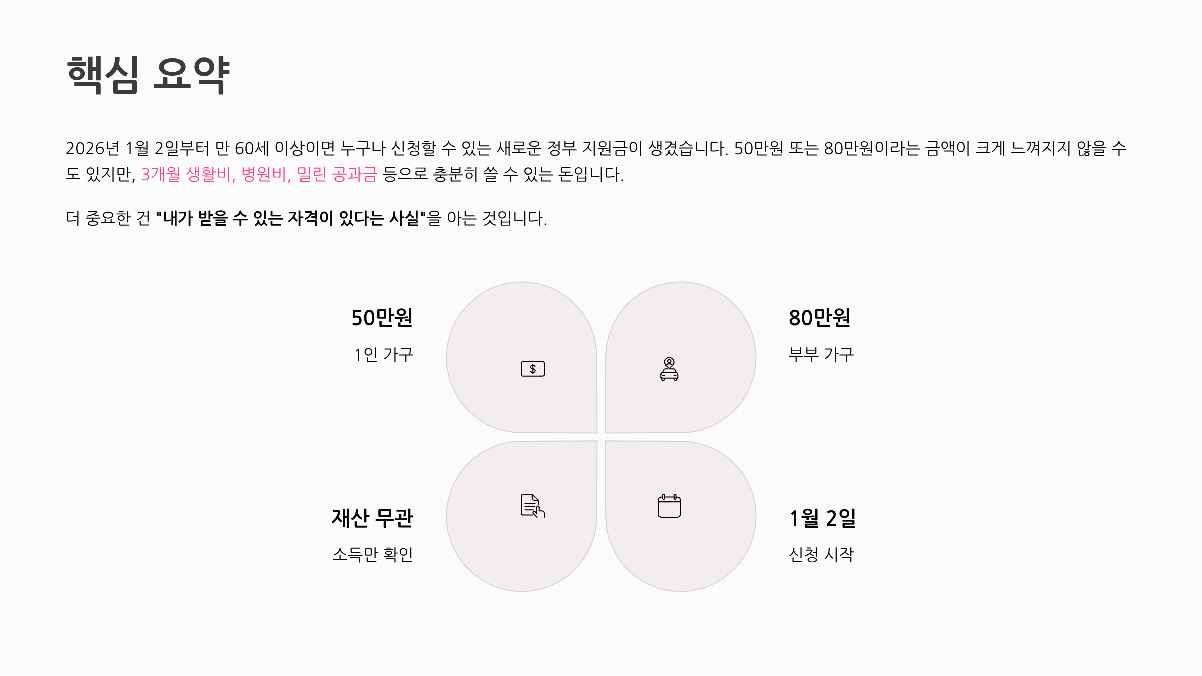 2026년 1월 2일부터 만 60세 이상이면 누구나 신청할 수 있는 새로운 정부 지원금이 생겼습니다. 50만원 또는 80만원이라는 금액이 크게 느껴지지 않을 수도 있지만, 3개월 생활비, 병원비, 밀린 공과금 등으로 충분히 쓸 수 있는 돈입니다.