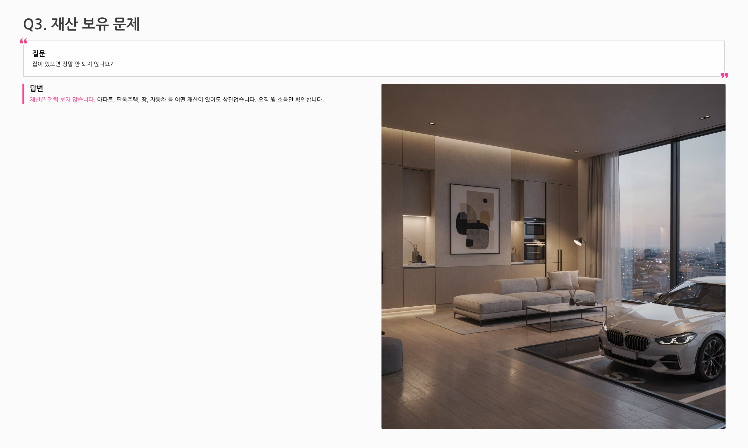 A. 재산은 전혀 보지 않습니다. 아파트, 단독주택, 땅, 자동차 등 어떤 재산이 있어도 상관없습니다. 오직 월 소득만 확인합니다.