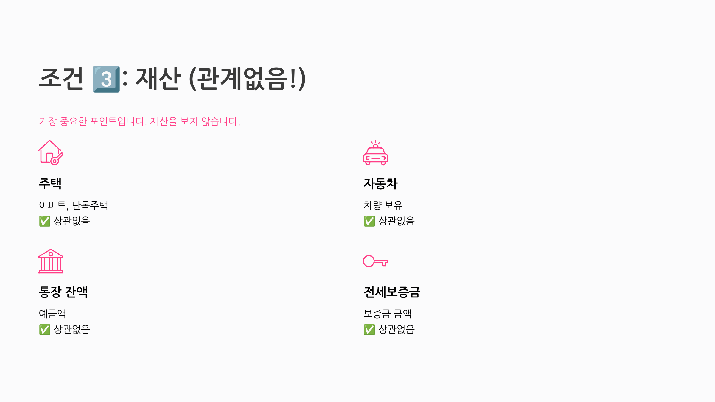 - ✅ 통장에 3,000만원 있어도 월 소득 150만원 = 신청 가능!