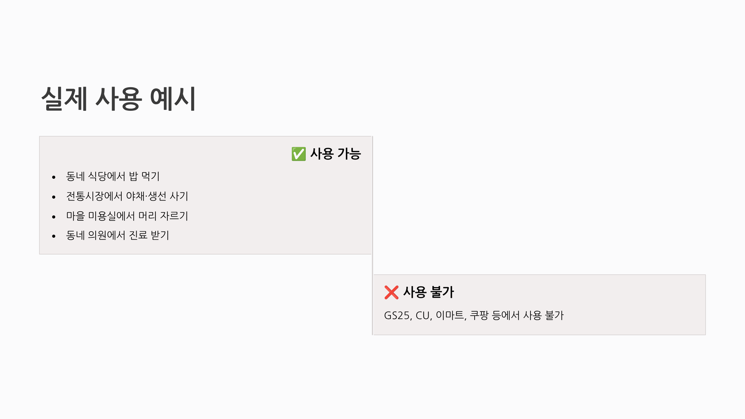 - ❌ 사용 불가: 마트, 편의점, 할인점, 온라인 쇼핑 등
