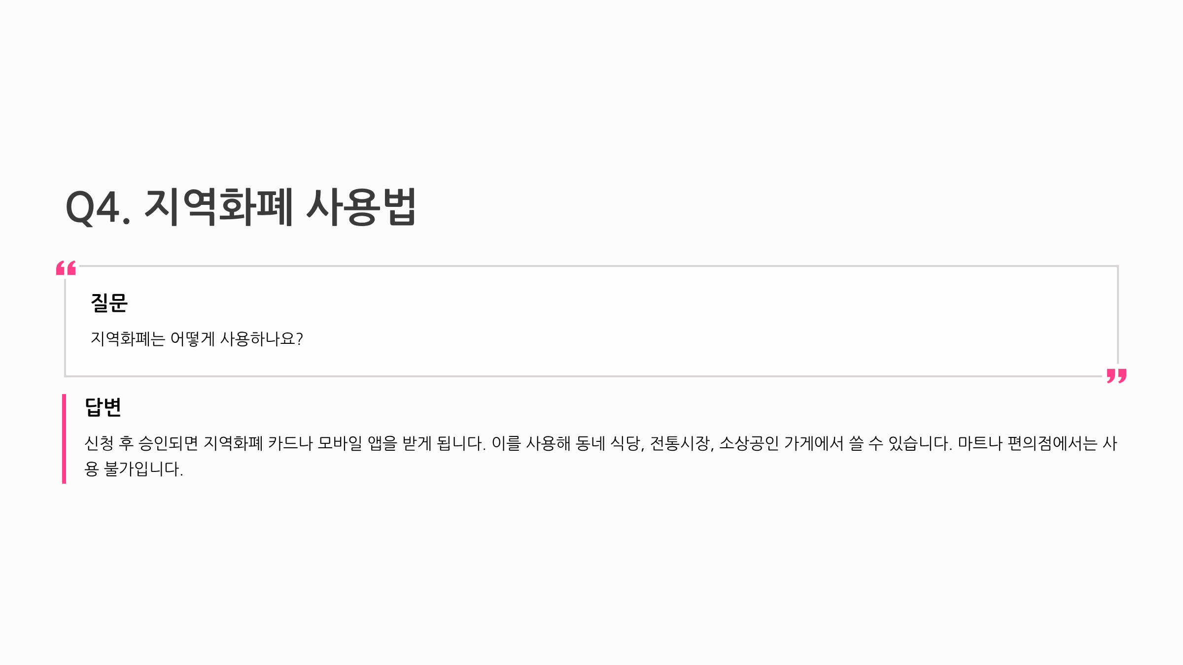 A. 신청 후 승인되면 지역화폐 카드나 모바일 앱을 받게 됩니다. 이를 사용해 동네 식당, 전통시장, 소상공인 가게에서 쓸 수 있습니다. 마트나 편의점에서는 사용 불가입니다.
