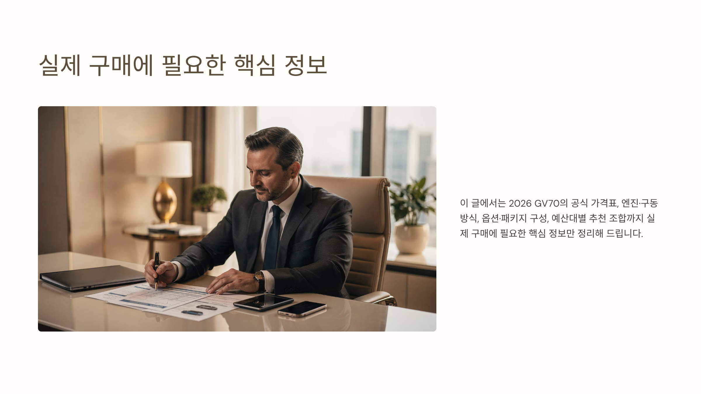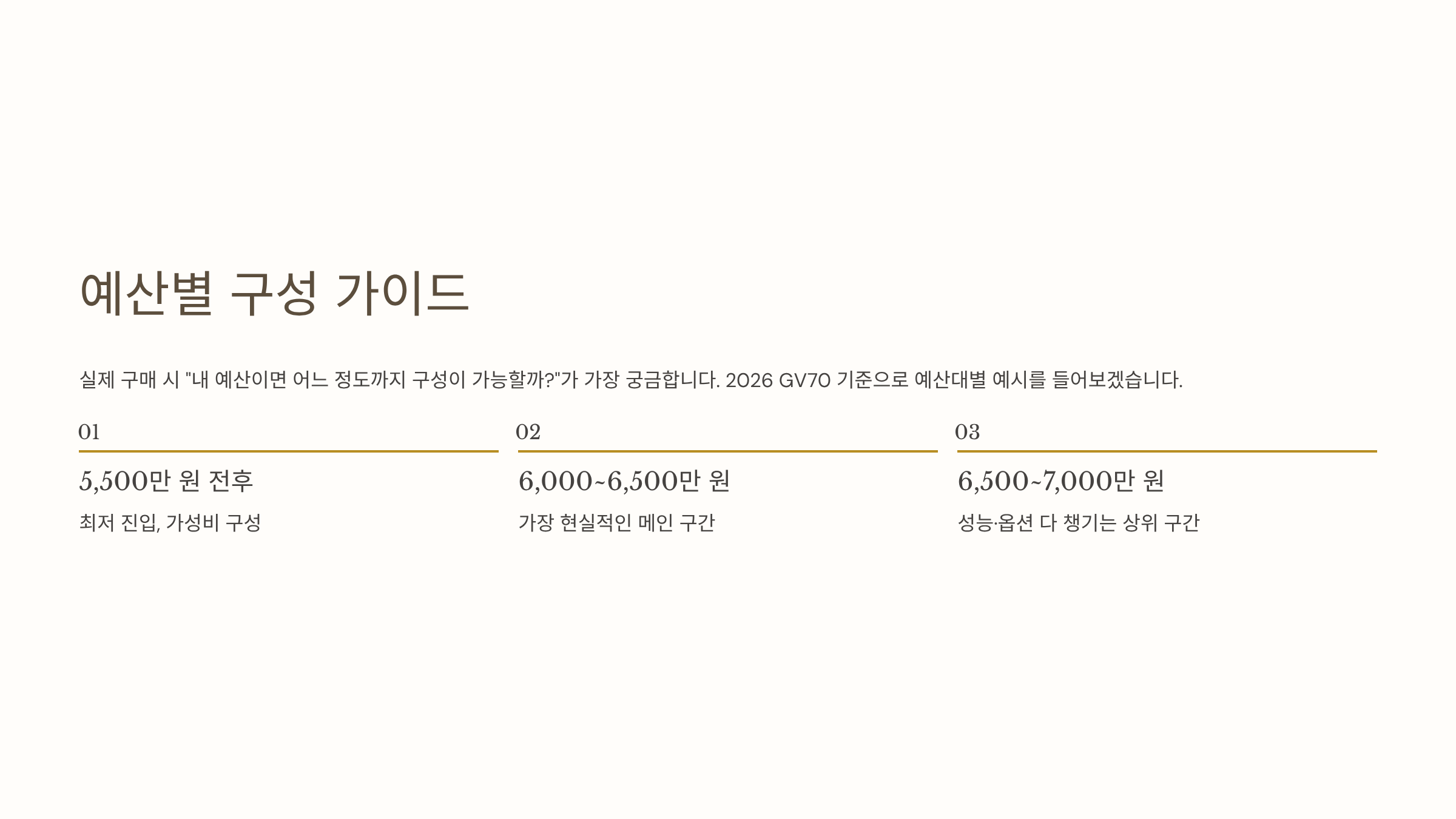 실제 구매 시 “내 예산이면 어느 정도까지 구성이 가능할까?”가 가장 궁금합니다. 2026 GV70 기준으로 예산대별 예시를 들어보겠습니다.
