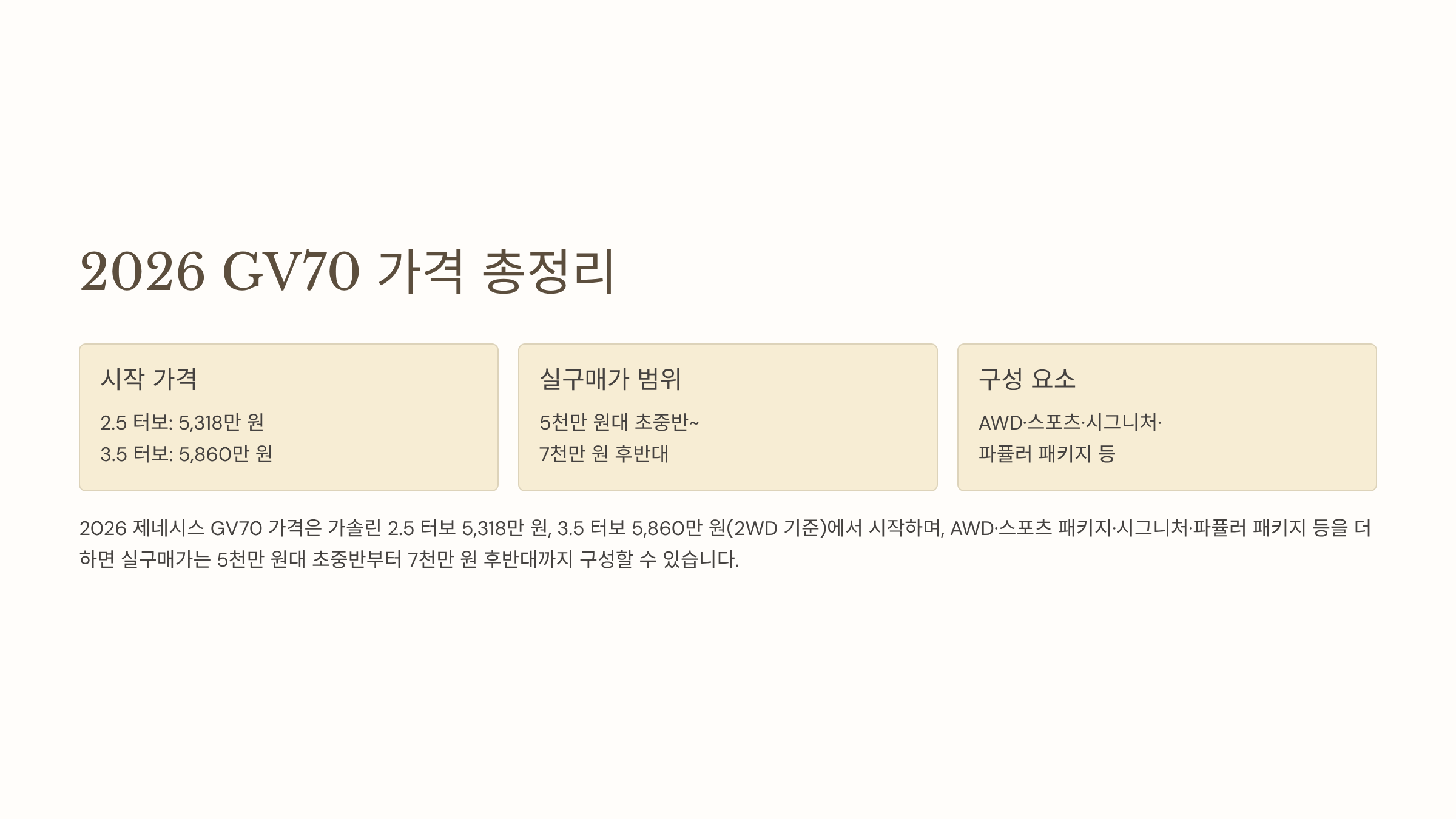 - 2026 제네시스 GV70 가격은 가솔린 2.5 터보 5,318만 원, 3.5 터보 5,860만 원(2WD 기준)에서 시작하며,