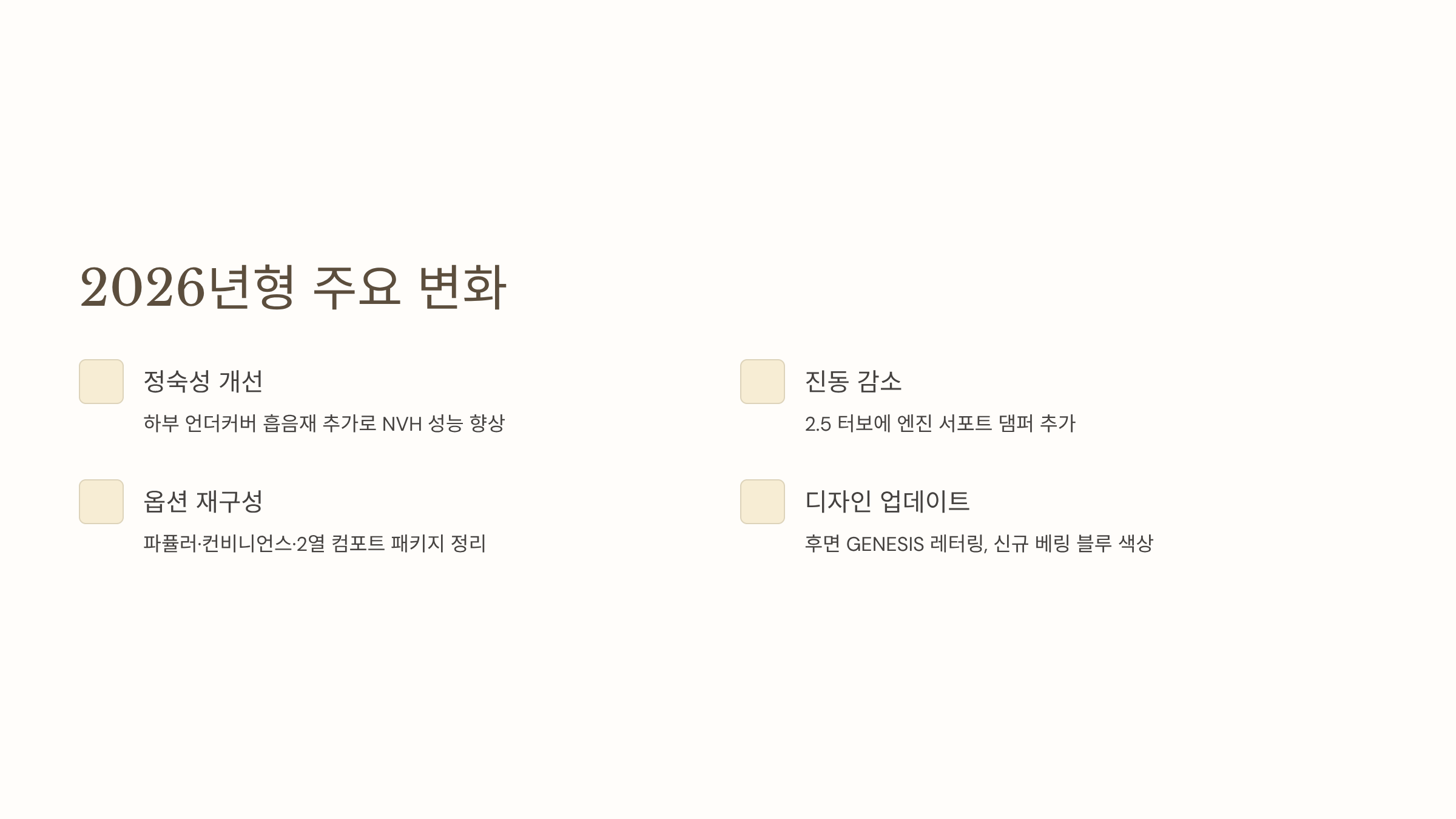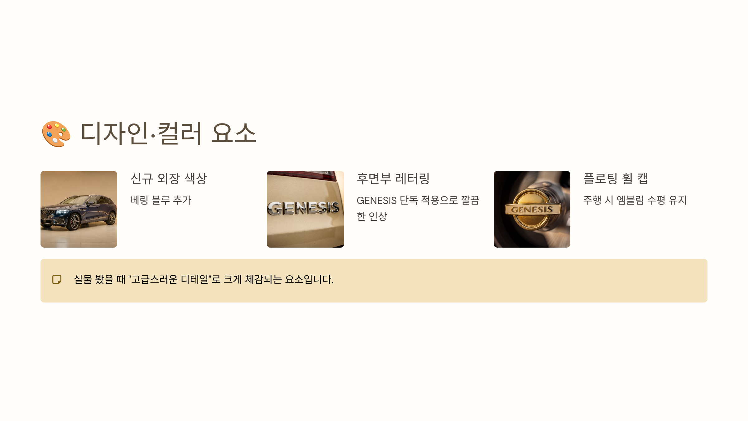 - 후면부 레터링: GENESIS 단독 레터링만 적용 → 더 깔끔한 인상
