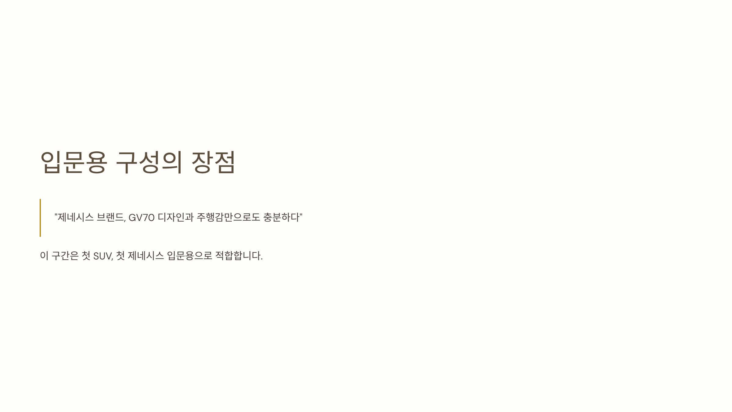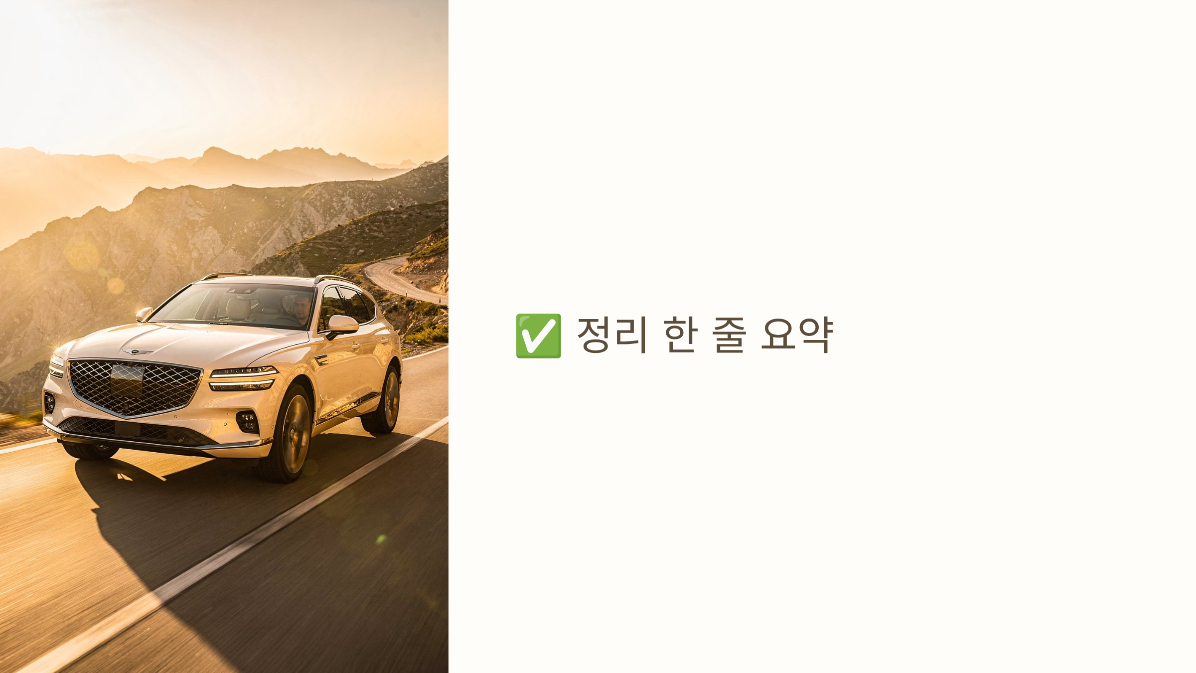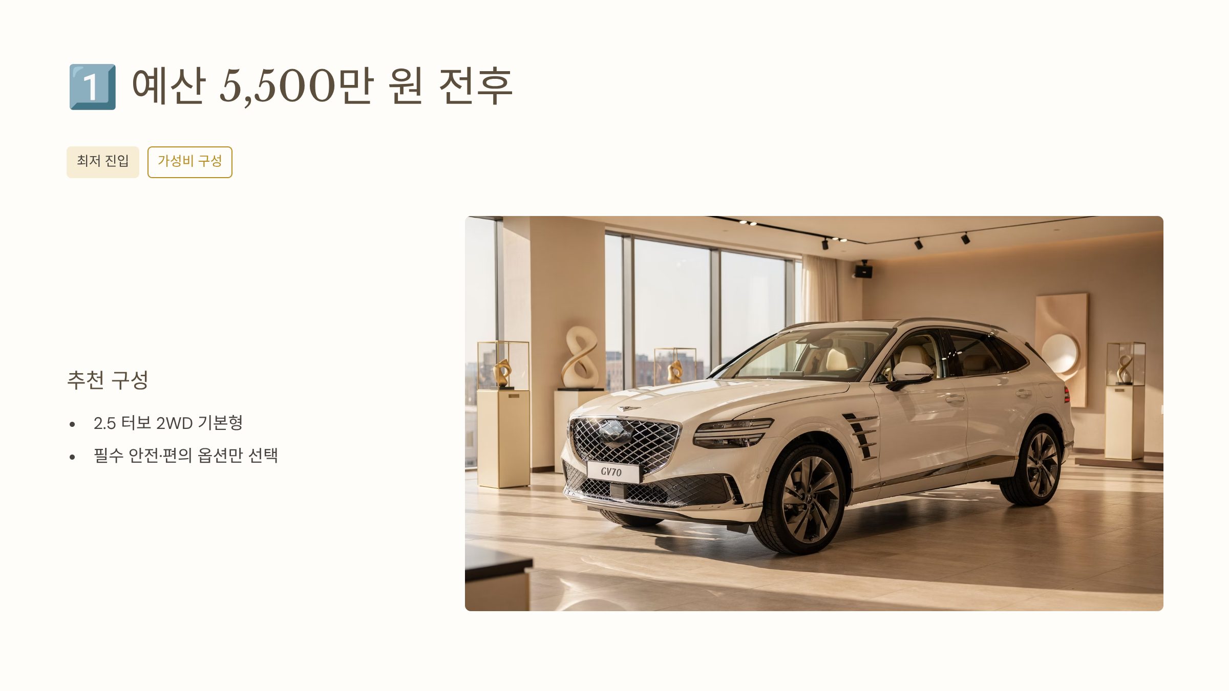 이 구간은 “제네시스 브랜드, GV70 디자인과 주행감만으로도 충분하다”는 분들이 선택하기 좋습니다. 첫 SUV, 첫 제네시스 입문용으로 적합합니다.