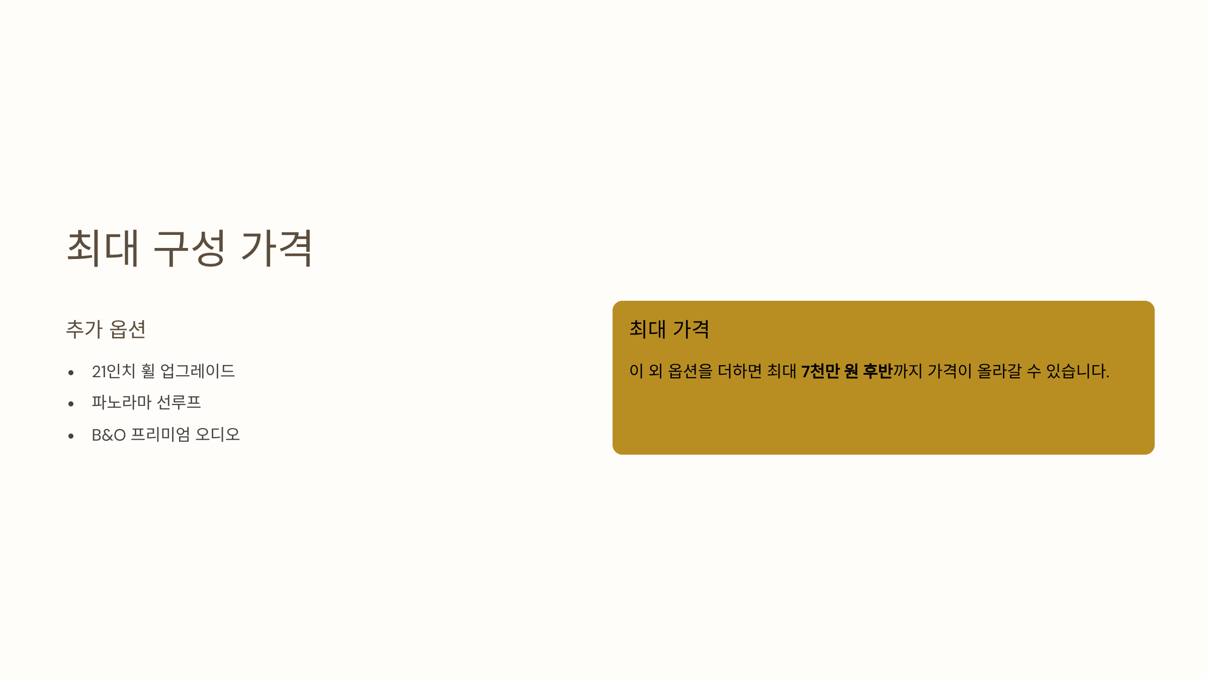 이 외에 휠 업그레이드(21인치), 파노라마 선루프, B&O 프리미엄 오디오 등 옵션을 더하면 최대 7천만 원 후반까지 가격이 올라갈 수 있습니다.