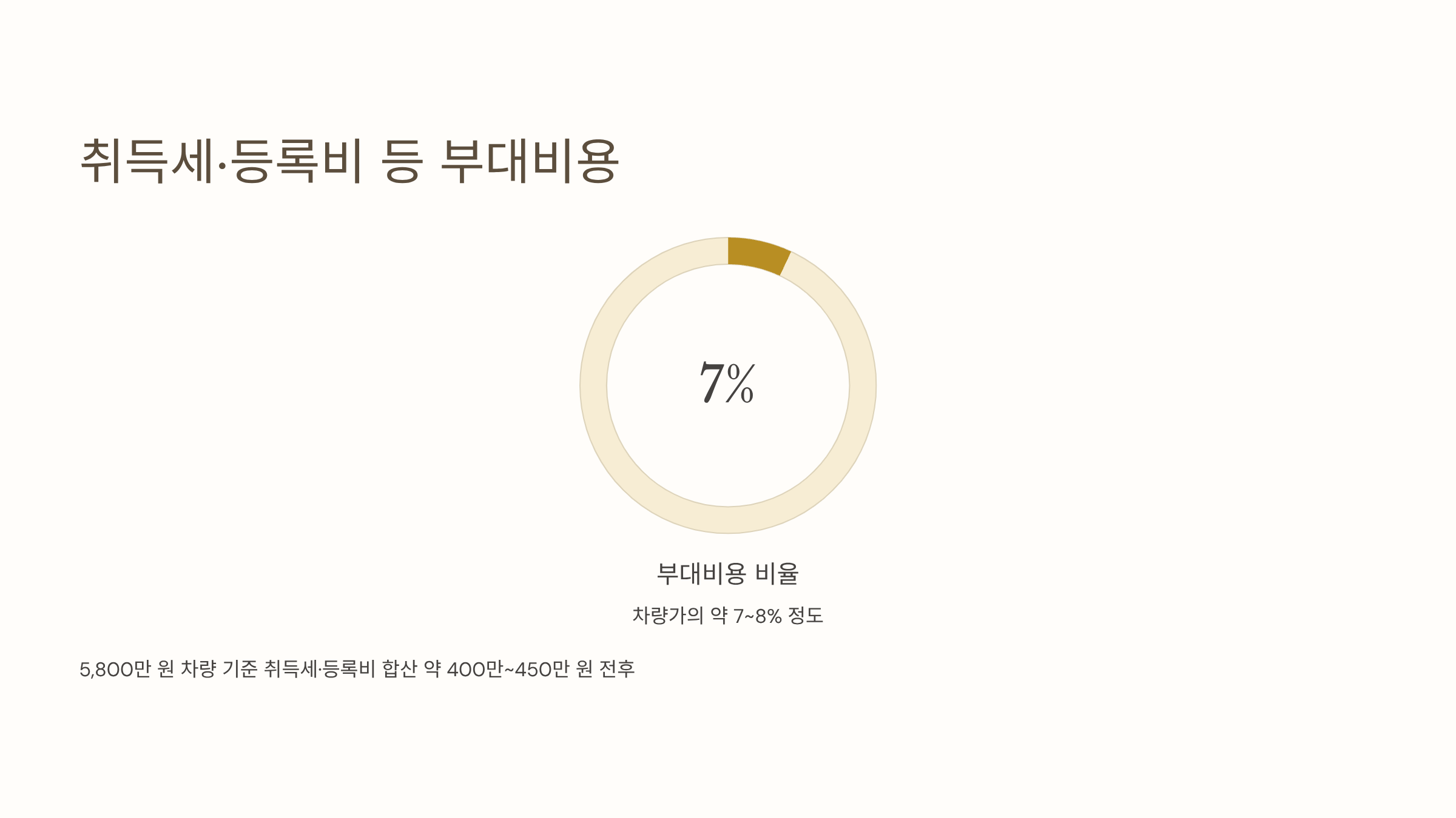 - 차량가의 약 7~8% 정도를 잡으면 대략적인 총비용 산출 가능