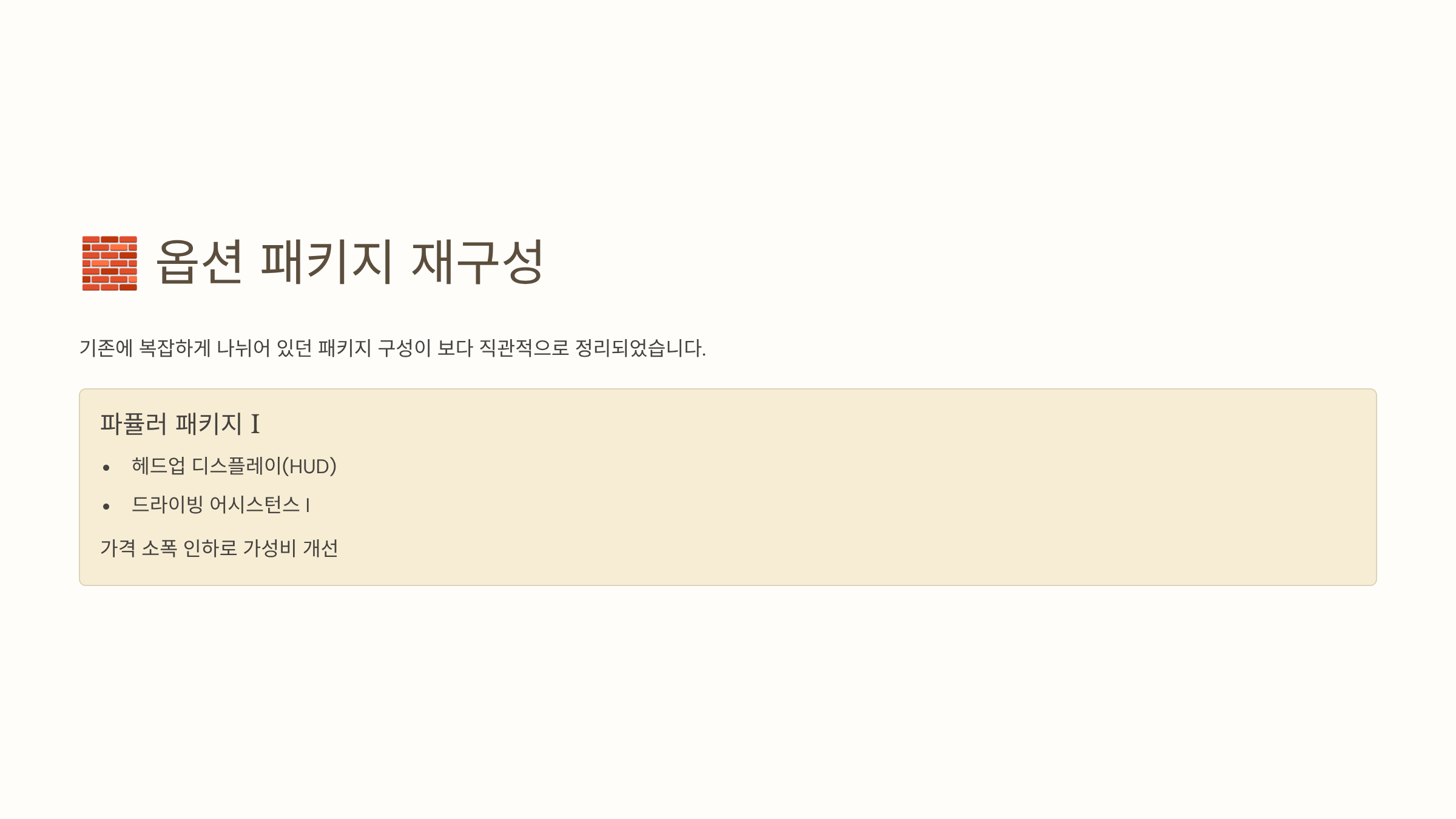 - 파퓰러 패키지·컨비니언스·2열 컴포트 패키지 등 옵션 재구성