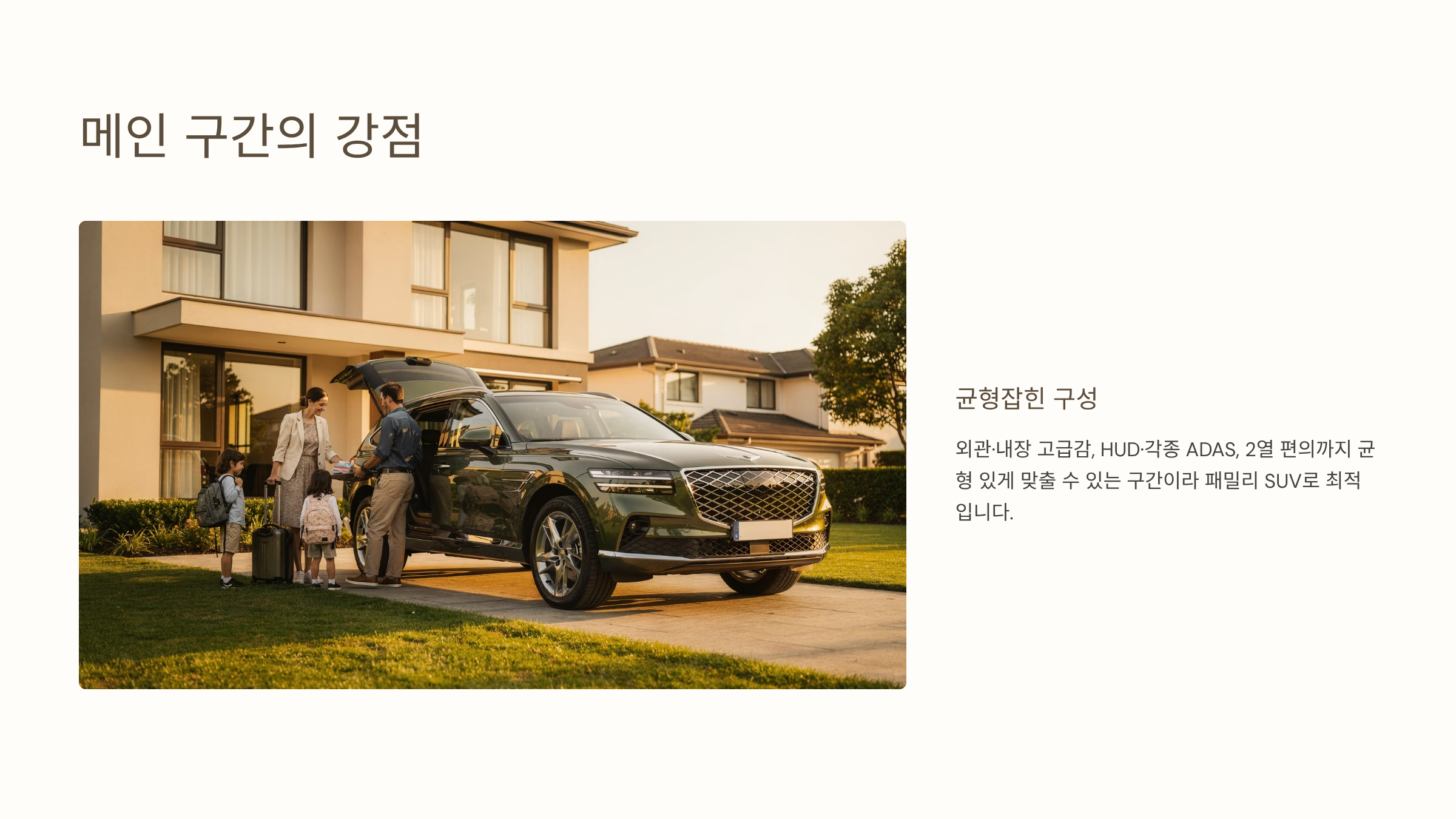 외관·내장 고급감, HUD·각종 ADAS, 2열 편의까지 균형 있게 맞출 수 있는 구간이라 패밀리 SUV로 최적입니다.
