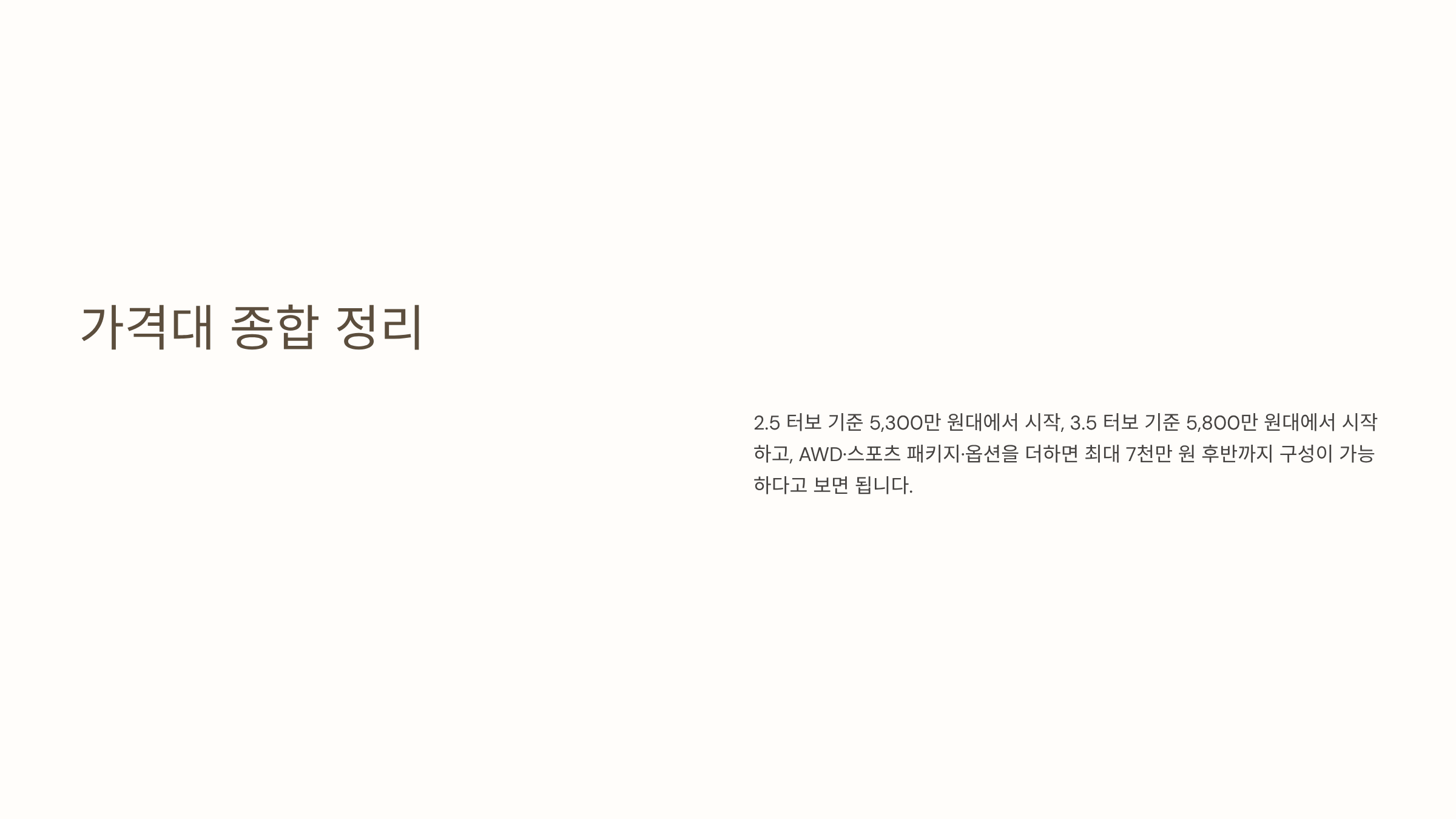 2.5 터보 기준 5,300만 원대에서 시작, 3.5 터보 기준 5,800만 원대에서 시작하고, AWD·스포츠 패키지·옵션을 더하면 최대 7천만 원 후반까지 구성이 가능하다고 보면 됩니다.