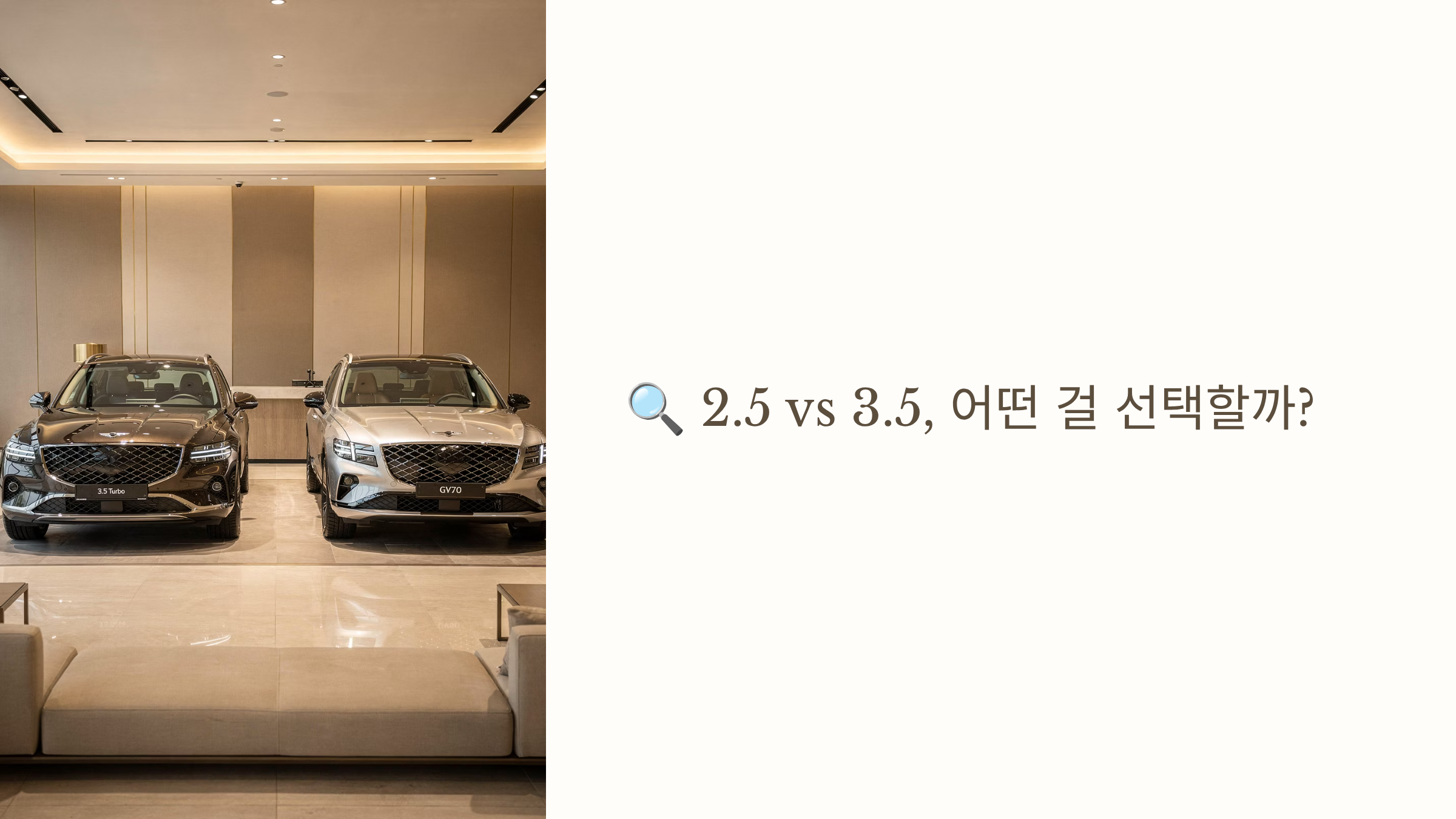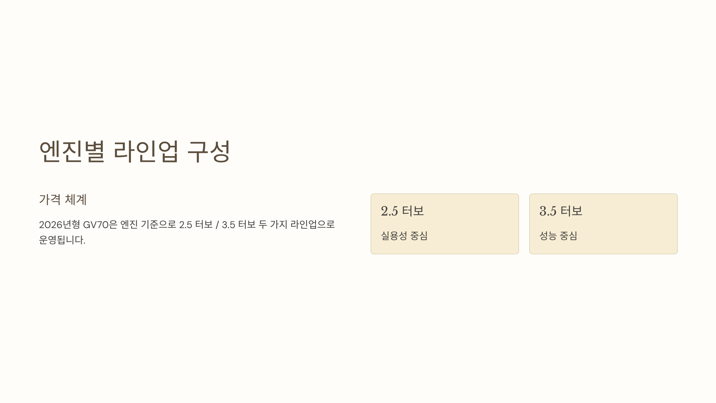 2026년형 GV70은 엔진 기준으로 2.5 터보 / 3.5 터보 두 가지 라인업으로 운영됩니다.