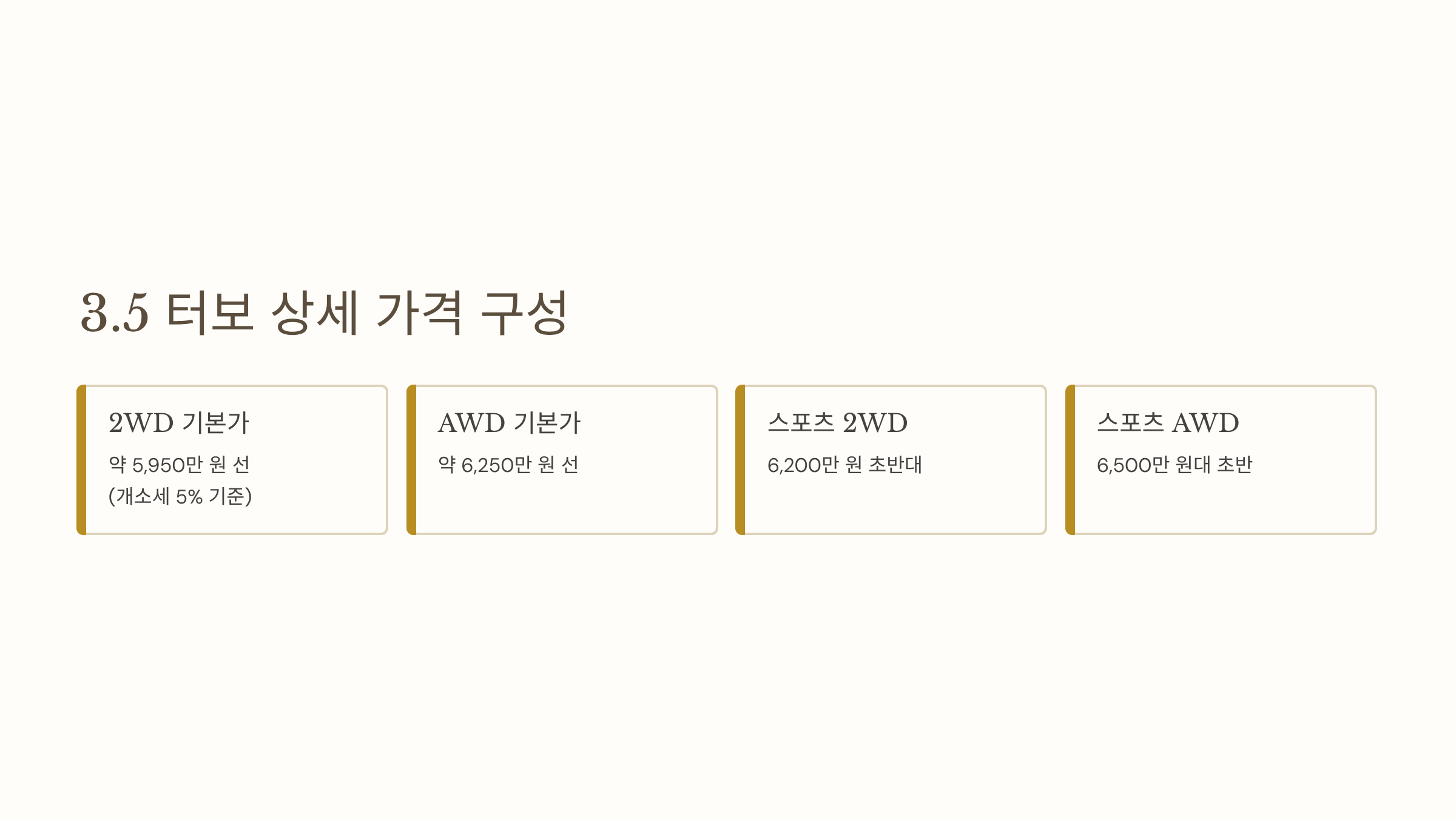 - 3.5 터보 AWD 기본가: 약 6,250만 원 선