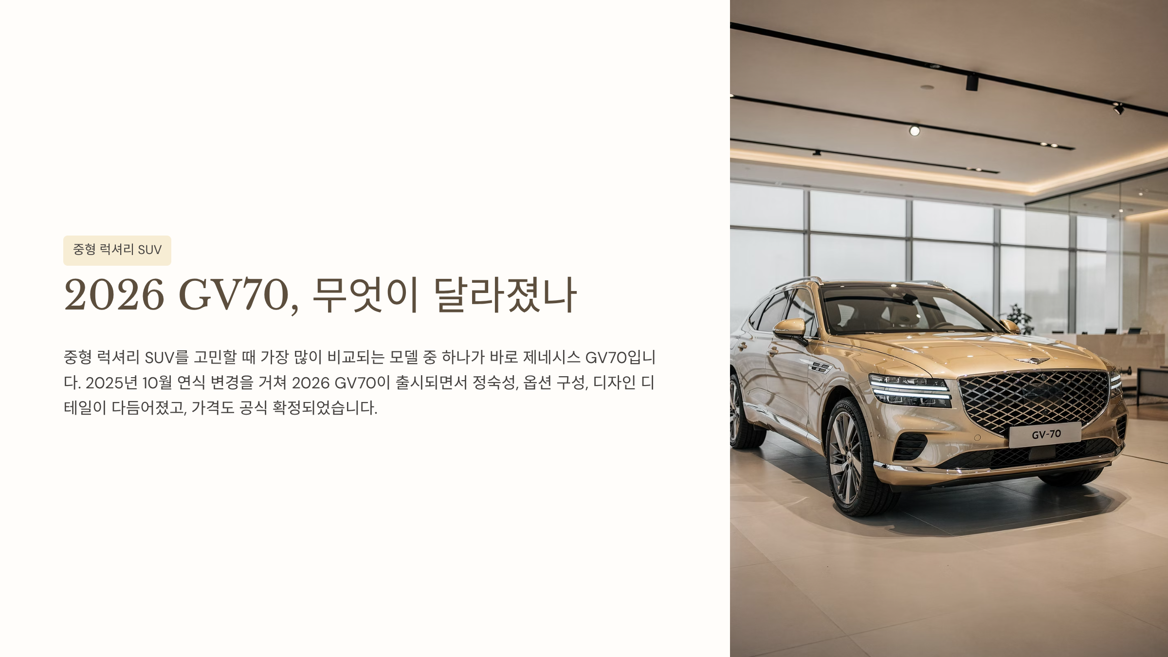 중형 럭셔리 SUV를 고민할 때 가장 많이 비교되는 모델 중 하나가 바로 제네시스 GV70입니다. 2025년 10월 연식 변경을 거쳐 2026 GV70이 출시되면서 정숙성, 옵션 구성, 디자인 디테일이 다듬어졌고, 가격도 공식 확정되었습니다.