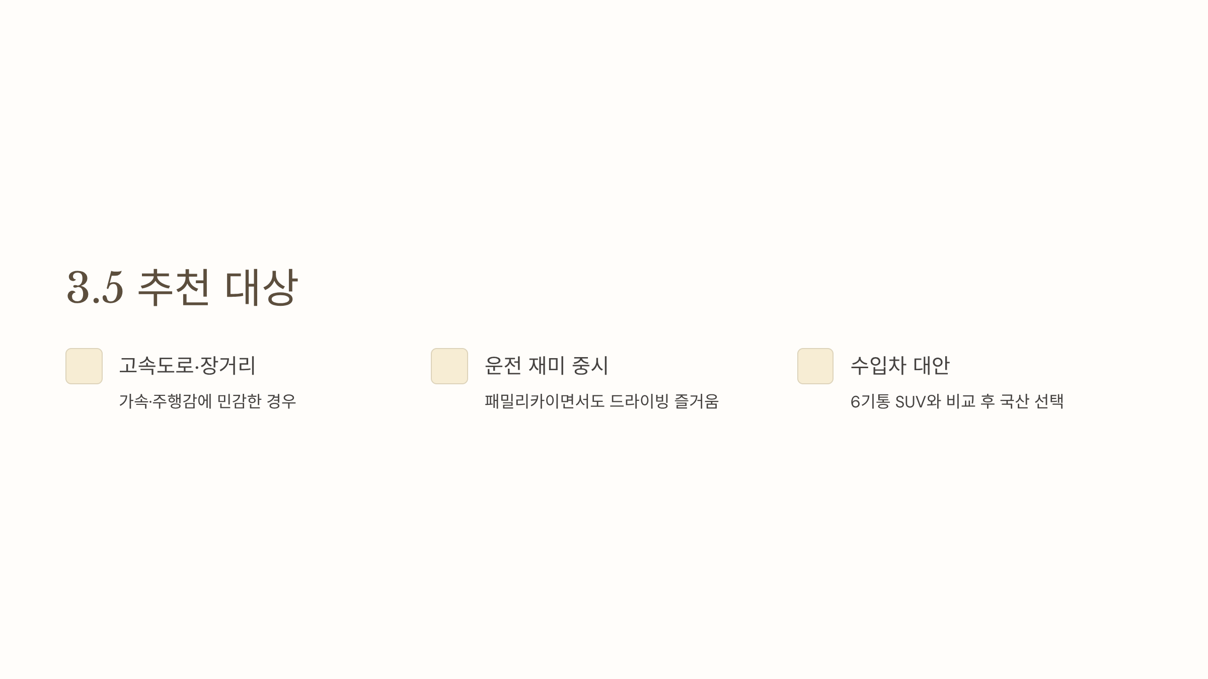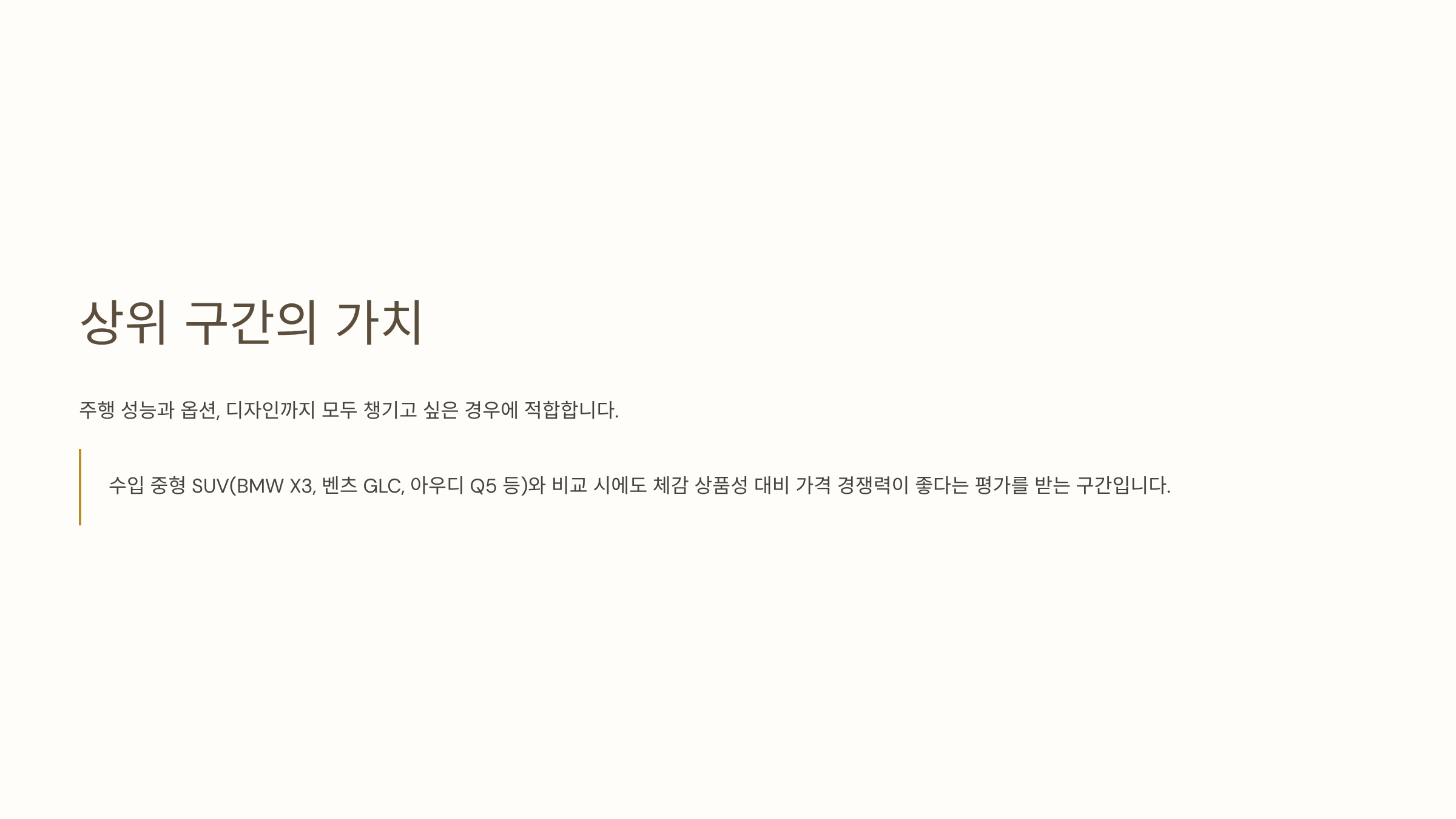 주행 성능과 옵션, 디자인까지 모두 챙기고 싶은 경우에 적합합니다. 수입 중형 SUV(BMW X3, 벤츠 GLC, 아우디 Q5 등)와 비교 시에도 체감 상품성 대비 가격 경쟁력이 좋다는 평가를 받는 구간입니다.
