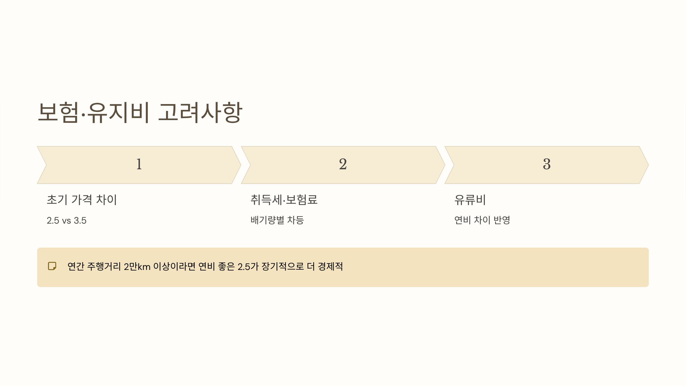 - 2.5 vs 3.5는 초기 가격 차이 + 취득세·보험료·유류비 차이까지 고려해야 함