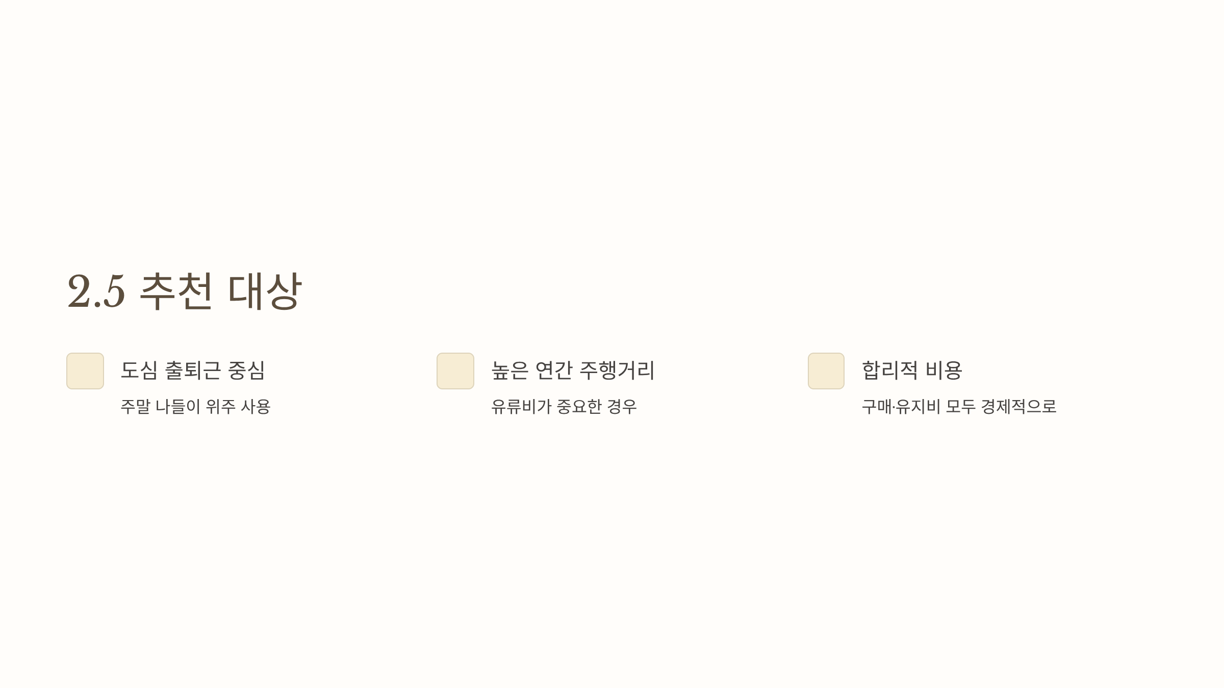 - 연비·가격 유리, 도심 위주 사용에 적합