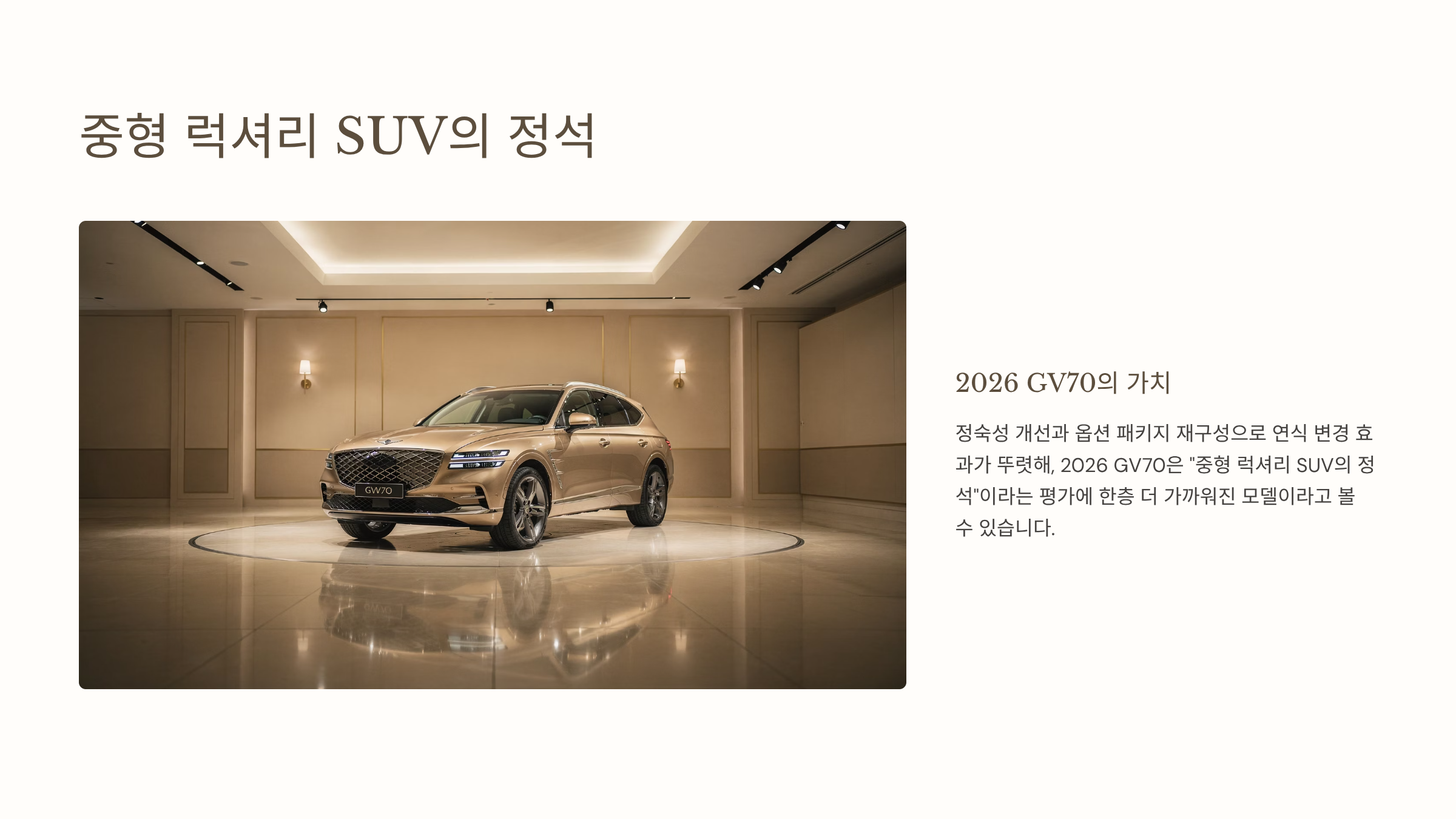- 정숙성 개선과 옵션 패키지 재구성으로 연식 변경 효과가 뚜렷해, 2026 GV70은 “중형 럭셔리 SUV의 정석”이라는 평가에 한층 더 가까워진 모델이라고 볼 수 있습니다.