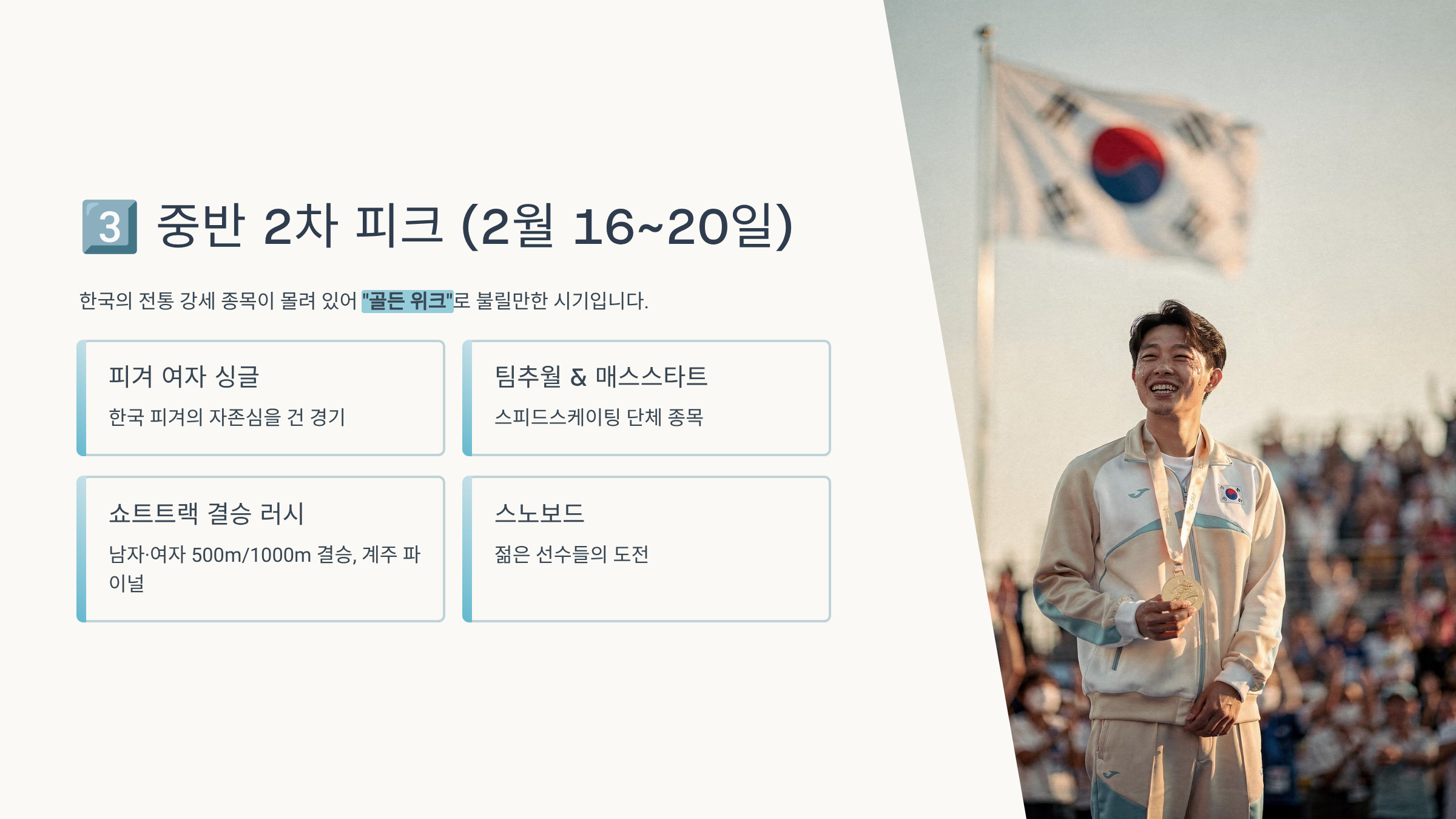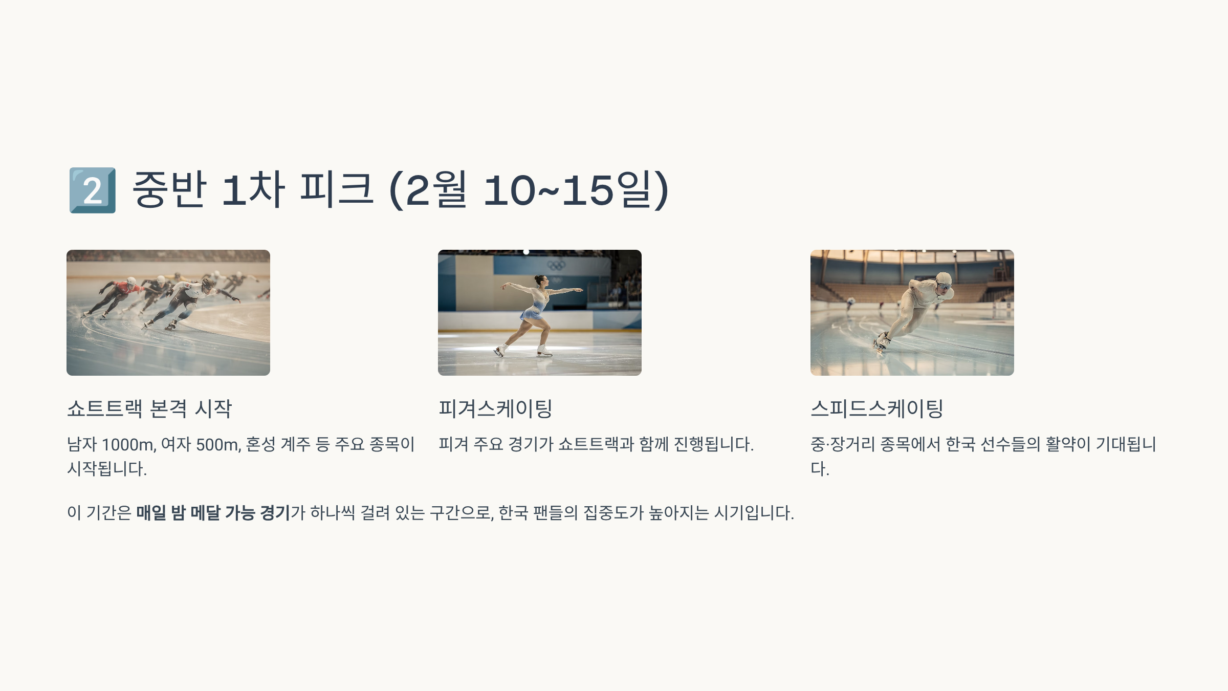 한국 입장에서는 매일 밤 메달 가능 경기가 하나씩 걸려 있는 구간