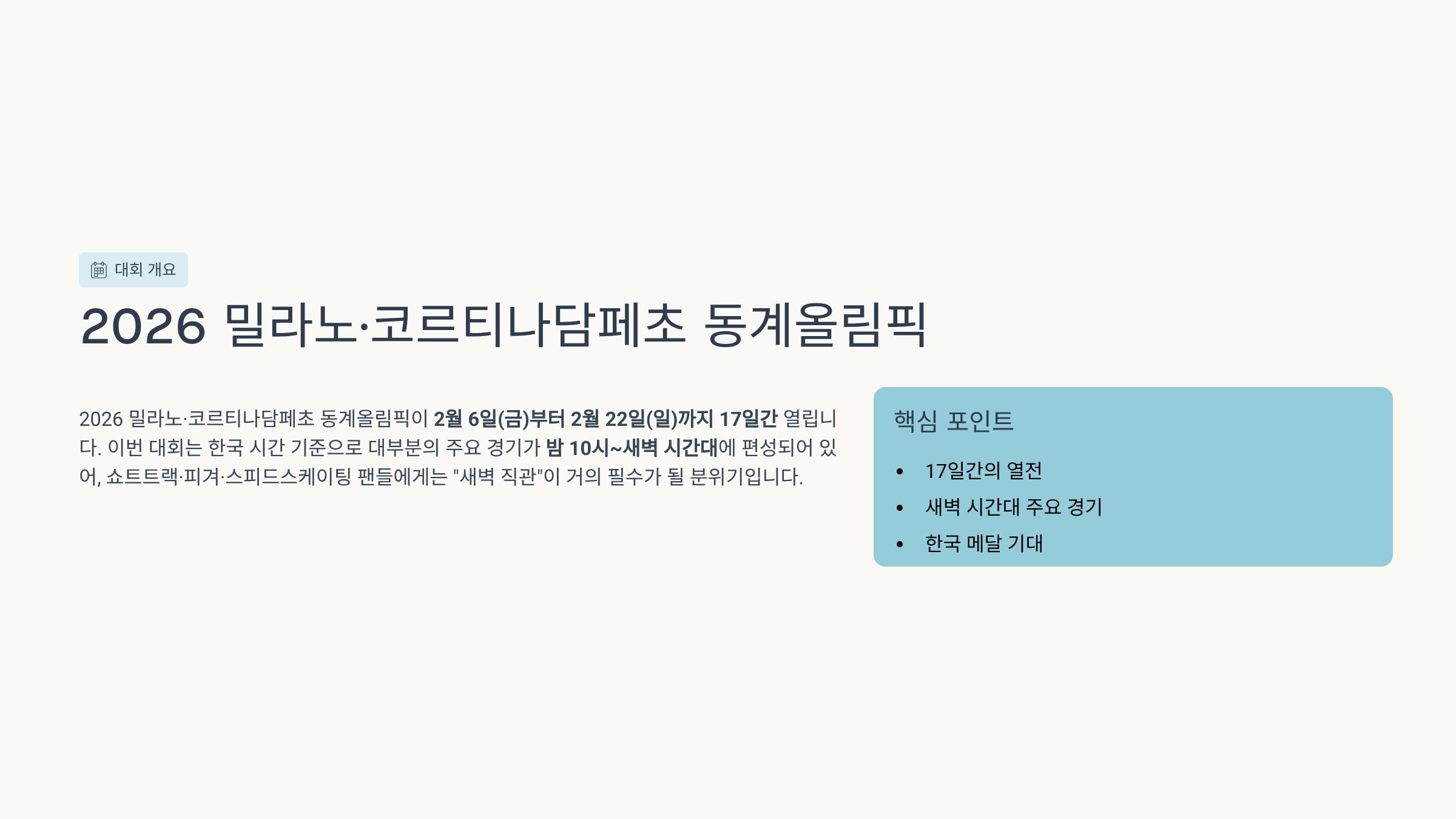 - 2026 밀라노·코르티나 동계올림픽은 2월 6일~22일, 한국보다 8시간 느린 이탈리아에서 개최됩니다.