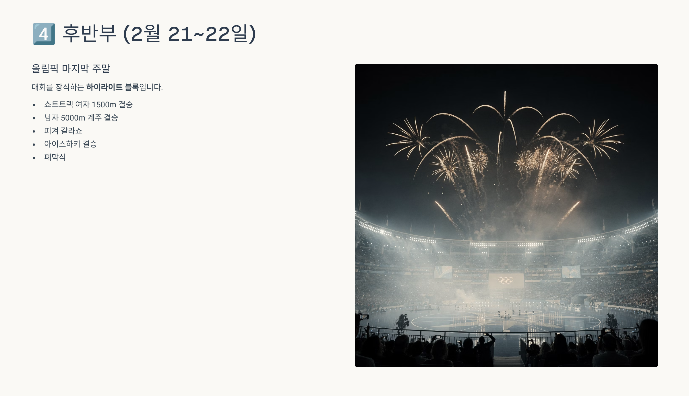 - 대신 개막식, 아이스하키, 피겨 단체전 초반 라운드 정도가 관전 포인트