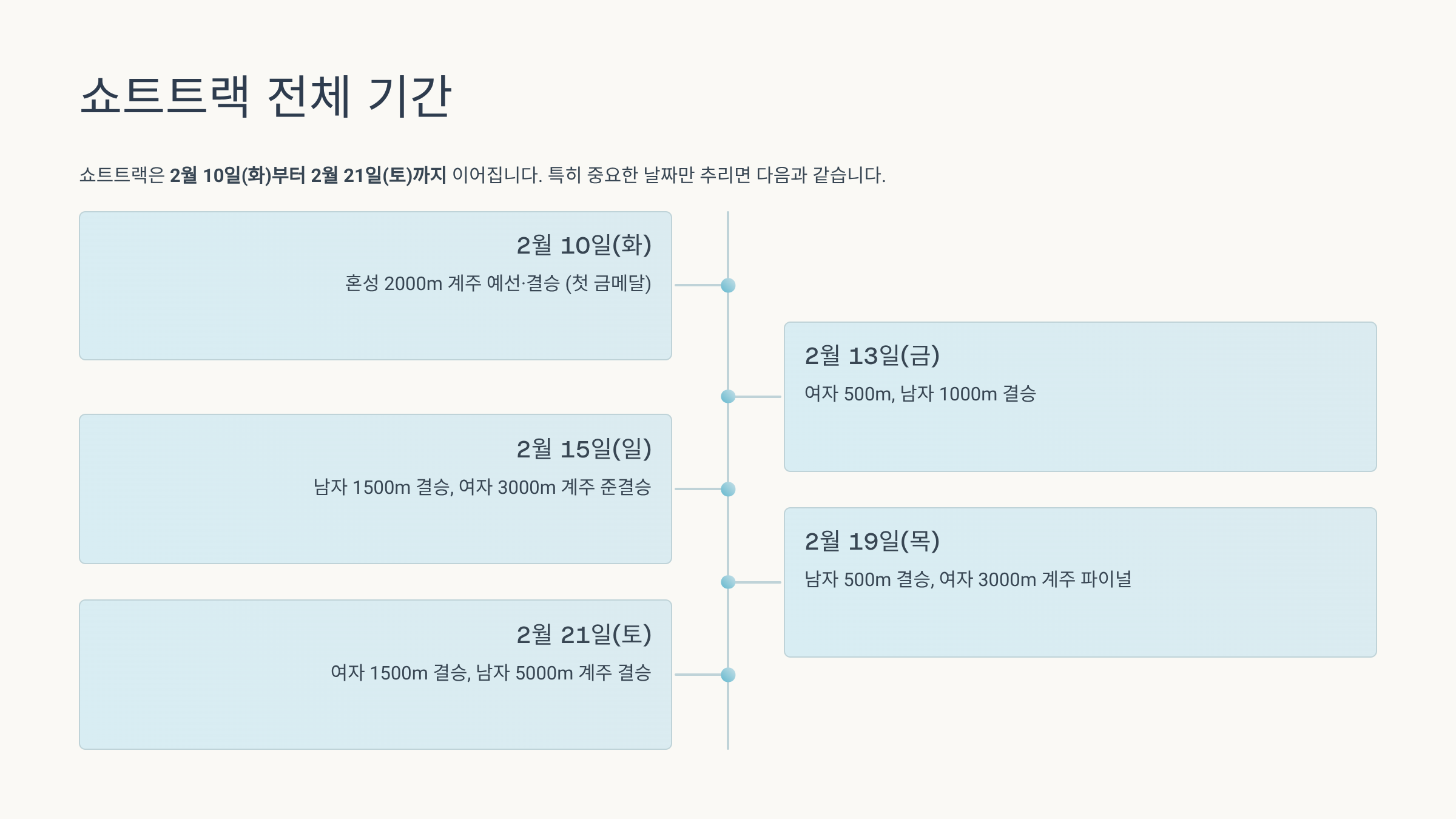 쇼트트랙은 2월 10일~21일 사이에 집중 편성됩니다. - 최민정 쇼트트랙 여자 1500m 결승은 2월 21일(토, 현지 기준)에 열리며,