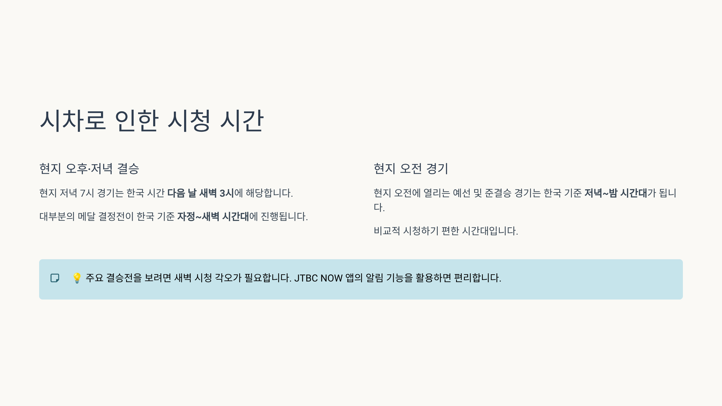 - 현지 저녁 7시 경기 → 한국 시간 다음 날 새벽 3시
