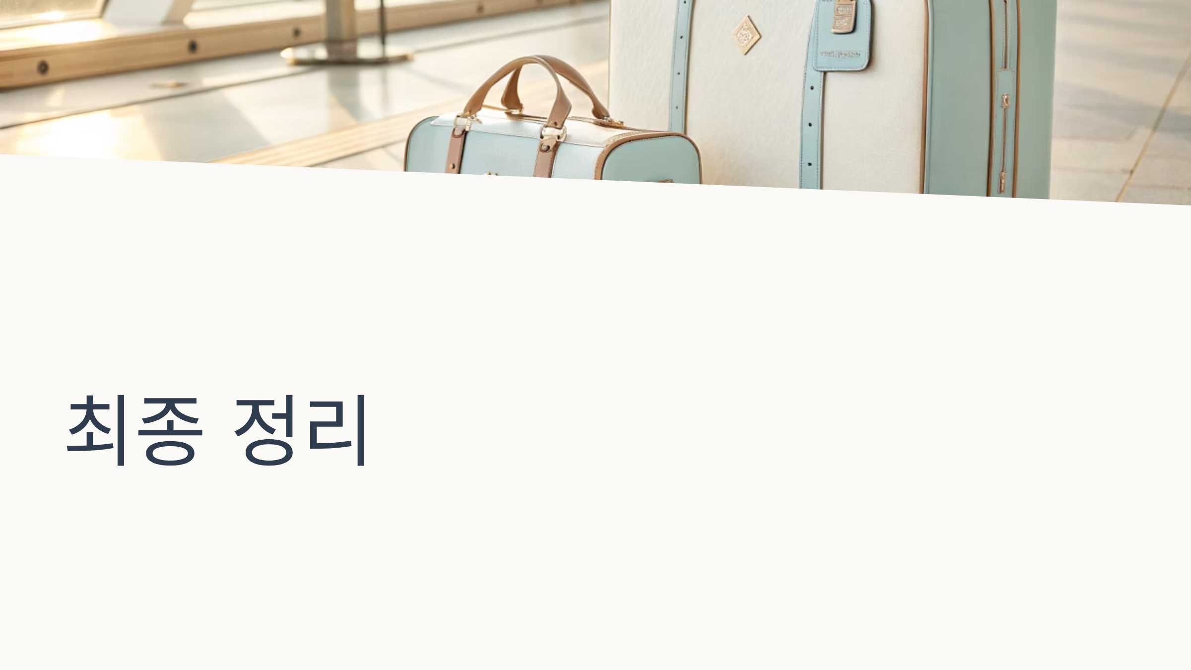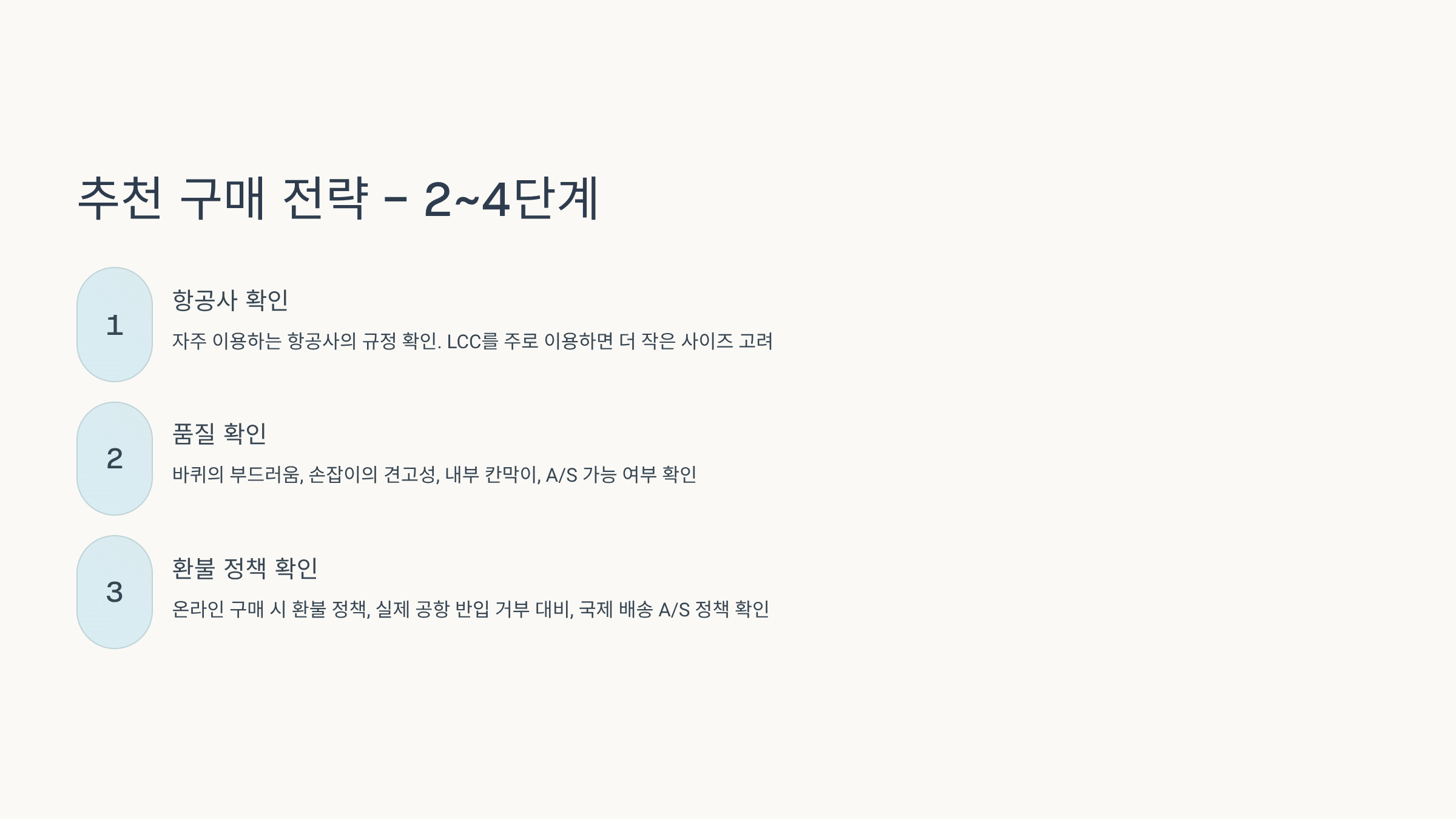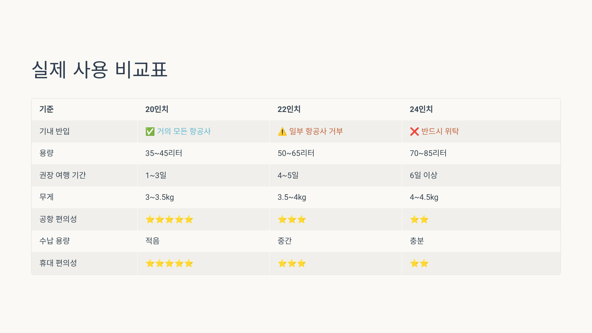 | 6일 이상 | 24인치 이상 | 장기 여행, 쇼핑 많음 | 반드시 위탁 수하물 |