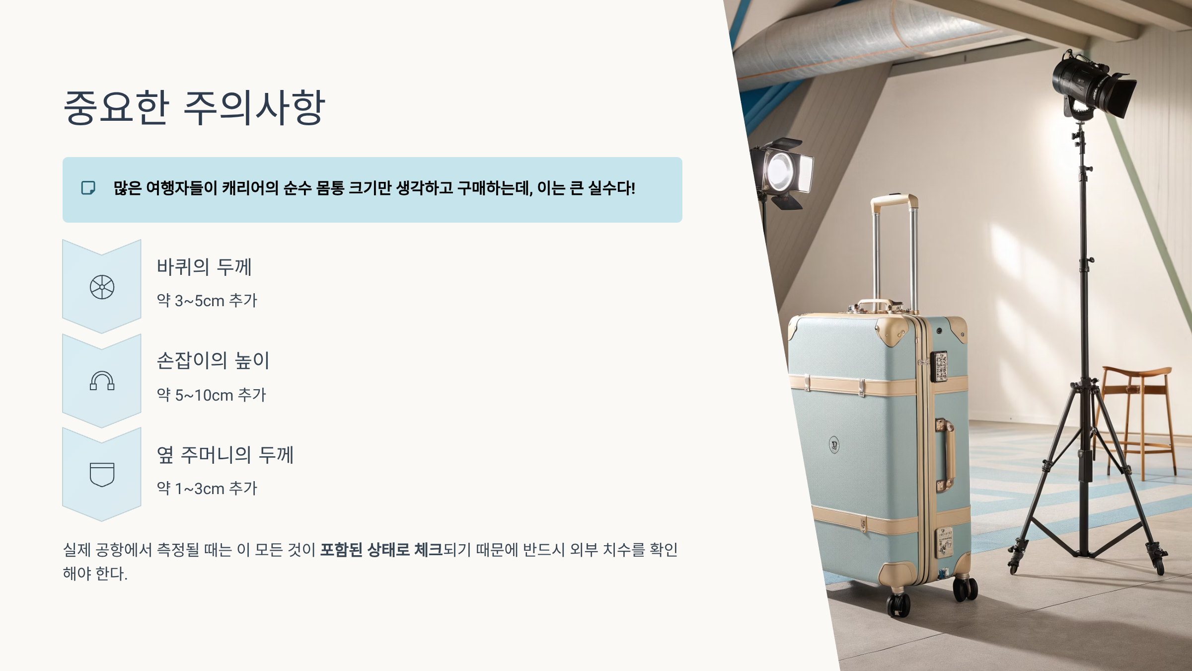 - 바퀴 두께를 포함하지 않음 → 기내 반입 시 문제 발생
